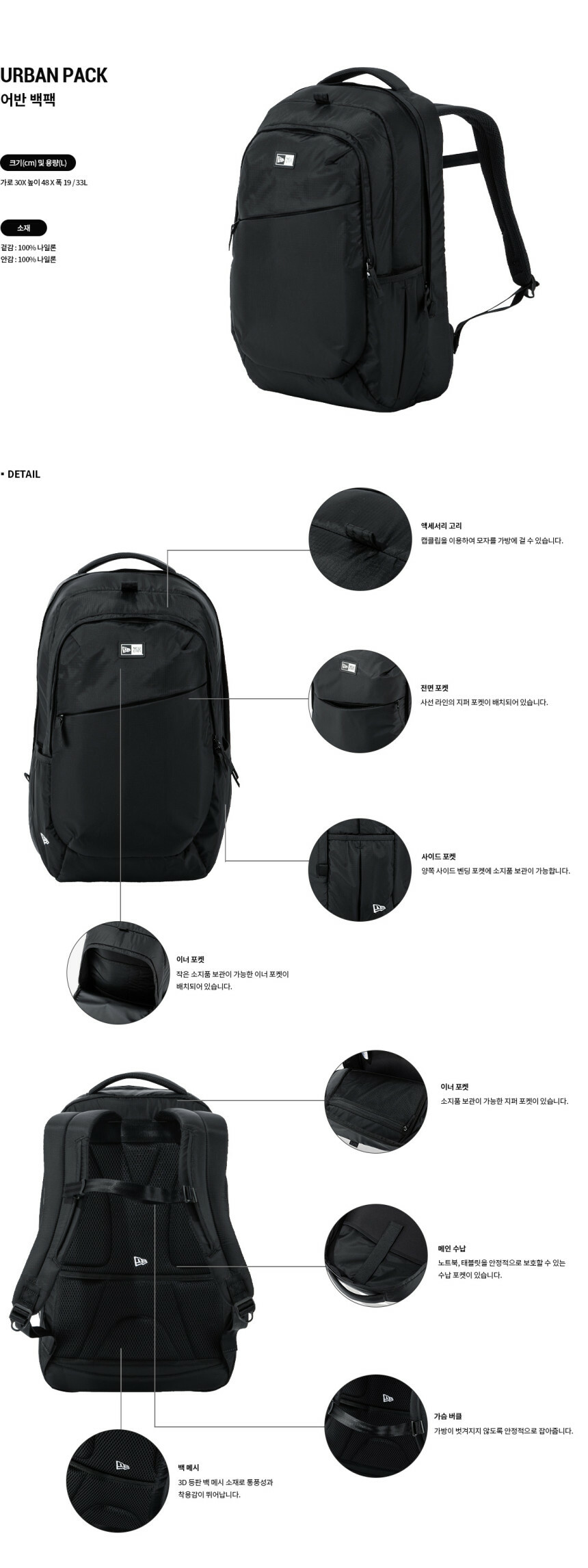 뉴에라 어반 백팩을 소개합니다. 군더더기 없는 심플한 디자인이 특징으로, 현대인에 맞는 스마트한 수납공간과 패드를 통한 편안하고 안정적인 착용감을 갖췄습니다. 학생용 책가방부터 성인을 위한 비즈니스 백팩까지 다양하게 활용이 가능합니다. 전면부 뉴에라 박스 로고로 포인트를 주었으며, 나일론 소재로 제작되어 내구성이 뛰어납니다. 어반 백팩은 베이직한 블랙 컬러 단독으로 만나보실 수 있습니다.