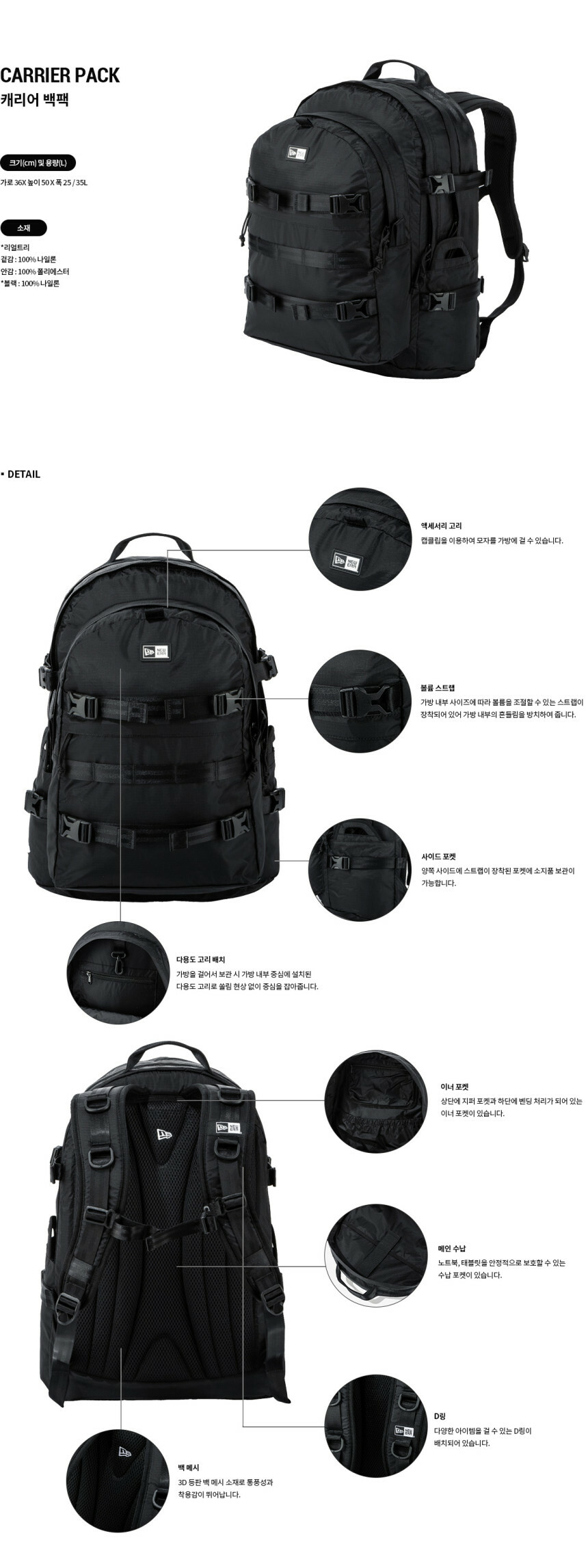 실용적인 디자인으로 꾸준히 사랑받는 뉴에라 캐리어 백팩이 새로운 버전으로 출시되었습니다. 35L 대용량을 베이스로 쿠션이 들어간 이너 포켓, 랩탑과 패드를 수납할 수 있는 공간, 보조포켓과 음료를 보관할 수 있는 사이드 포켓까지 다양한 포켓과 효율적인 끈 고리로 안정적인 수납이 가능합니다. 어깨 끈과 등 부분 패드 디테일로 장시간 착용에도 편안안 착용감을 선사합니다. 유저의 니즈를 만족시켜주는 디테일한 디자인으로 많은 사랑을 받고 있는 뉴에라 캐리어 백팩, 베이직한 블랙과 유니크한 리얼 트리 컬러로 만나보실 수 있습니다.