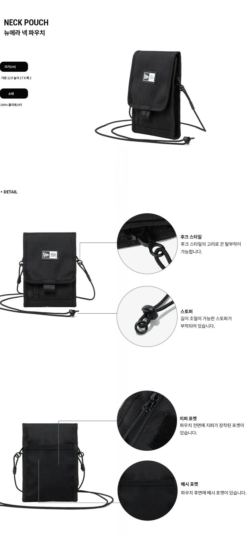 가벼운 소지품을 휴대하기 좋은 넥 파우치 컬렉션을 소개합니다. 길이 조절이 가능한 스트랩으로 제품 이름과 같이 목에 거치하여 착용하거나, 크로스백처럼 활용이 가능합니다. 전면에 뉴에라의 플래그 로고 패치가 부착되어 있으며 벨크로를 사용하여 열고 닫음이 간편합니다. 내부에는 지퍼 포켓이 있어 소지품을 안전하게 보관할 수 있으며, 폴리에스터 소재를 사용하여 가볍고 내구성이 뛰어납니다. 간단한 외출이나 여행 시 지갑 대용으로도 사용 가능한 넥 파우치 컬렉션을 지금 바로 만나보세요.