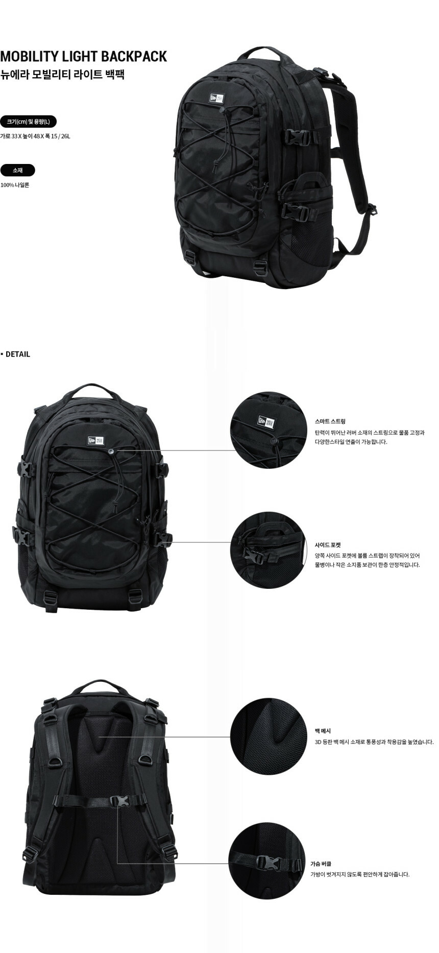 실용성을 극대화한 모빌리티 라이트 백팩 컬렉션을 소개합니다. 탄력이 뛰어난 스마트 스트링으로 가방에 보관하기 어려운 물품을 고정할 수 있으며, 내외부 포켓과 이너포켓으로 다양한 물품을 안전하게 보관할 수 있습니다. 측면의 사이드 포켓으로 스포츠 보틀이나 작은 소지품을 보관하기에 용이하며, 인체공학적으로 설계된 X형의 3D 백 메시 소재를 사용하여 뛰어난 착용감까지 갖췄습니다. 심플한 디자인으로 어디에나 매치하기 쉬우며 나일론 소재로 제작되어 내구성까지 뛰어나 다양한 활동에서 활용하기에 제격인 모빌리티 라이트 백팩을 지금 바로 2가지 컬러로 만나보세요.
