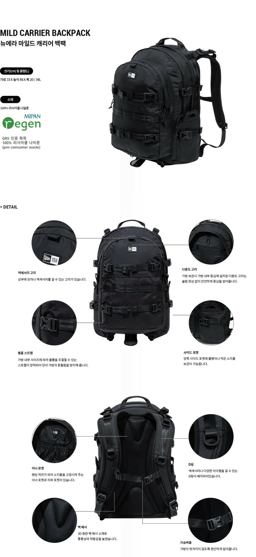 튼튼한 내구성과 실용성으로 꾸준히 사랑받아온 뉴에라 캐리어 백팩이 새로운 버전으로 돌아왔습니다. 스포티한 디자인에 다양한 포켓, 고리, 버클로 뛰어난 실용성을 자랑합니다. 3단 수납으로 넉넉한 수납 공간을 가지고 있으며, 측면 사이드 포켓에는 스포츠 보틀 혹은 작은 소지품을 보관하기에 용이합니다. 가방 본체와 스트랩에 부착된 다양한 고리는 액세서리 또는 모자를 걸어 휴대가 가능하며, 인체 공학적으로 설계된 3D 등판 백 매시는 착용감을 한층 높여줍니다. 환경을 생각하는 리사이클 나일론 소재로 제작되어 내구성이 좋고 가벼움까지 갖췄으며, 데일리백은 물론 각종 아웃도어 활동에서도 활용하기에 안성맞춤인 마일드 캐리어 백팩은 3가지 컬러로 만나보실 수 있습니다.