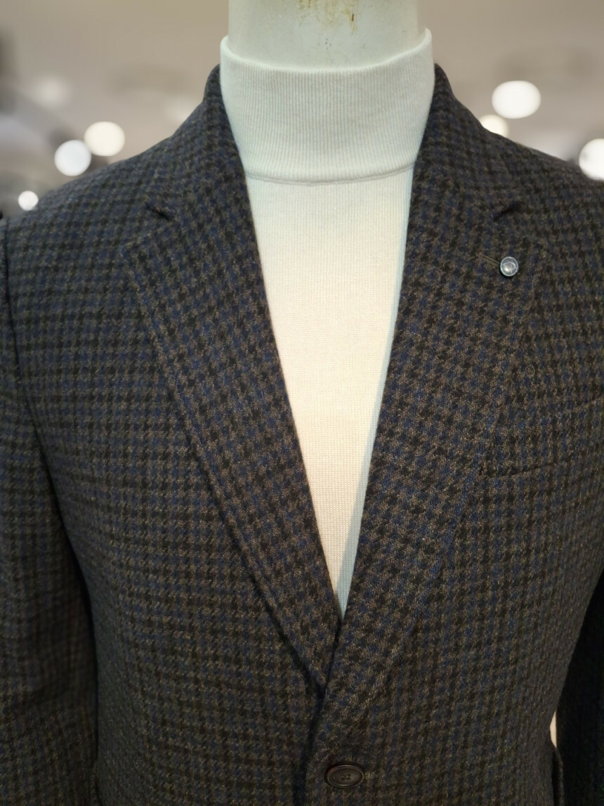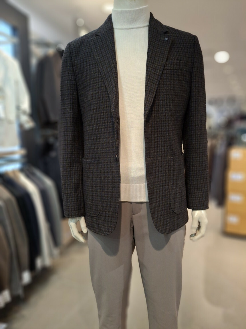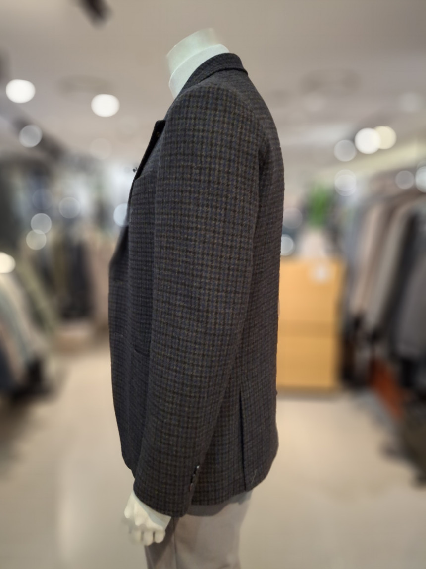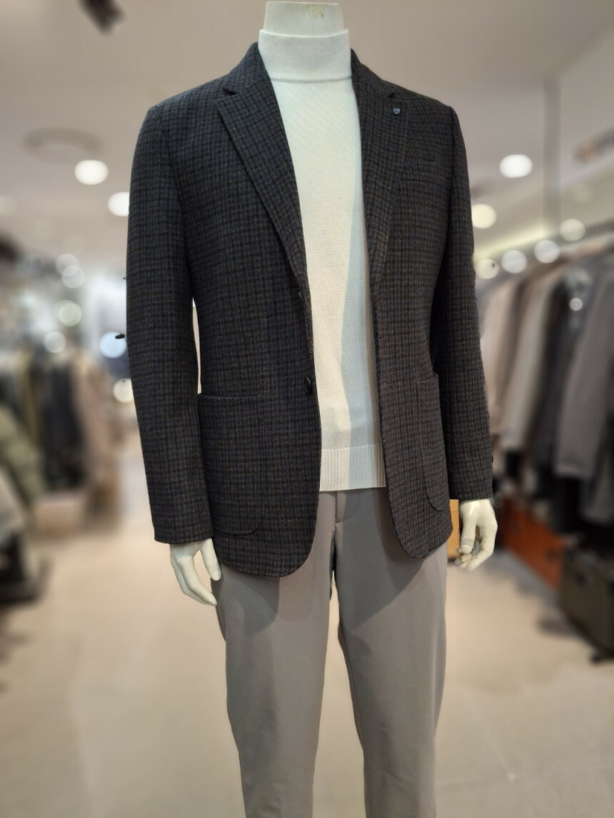 울70% , 브라운베이스에 네이비컬러 체크가 고급스러운 등판누빔 모직자켓
