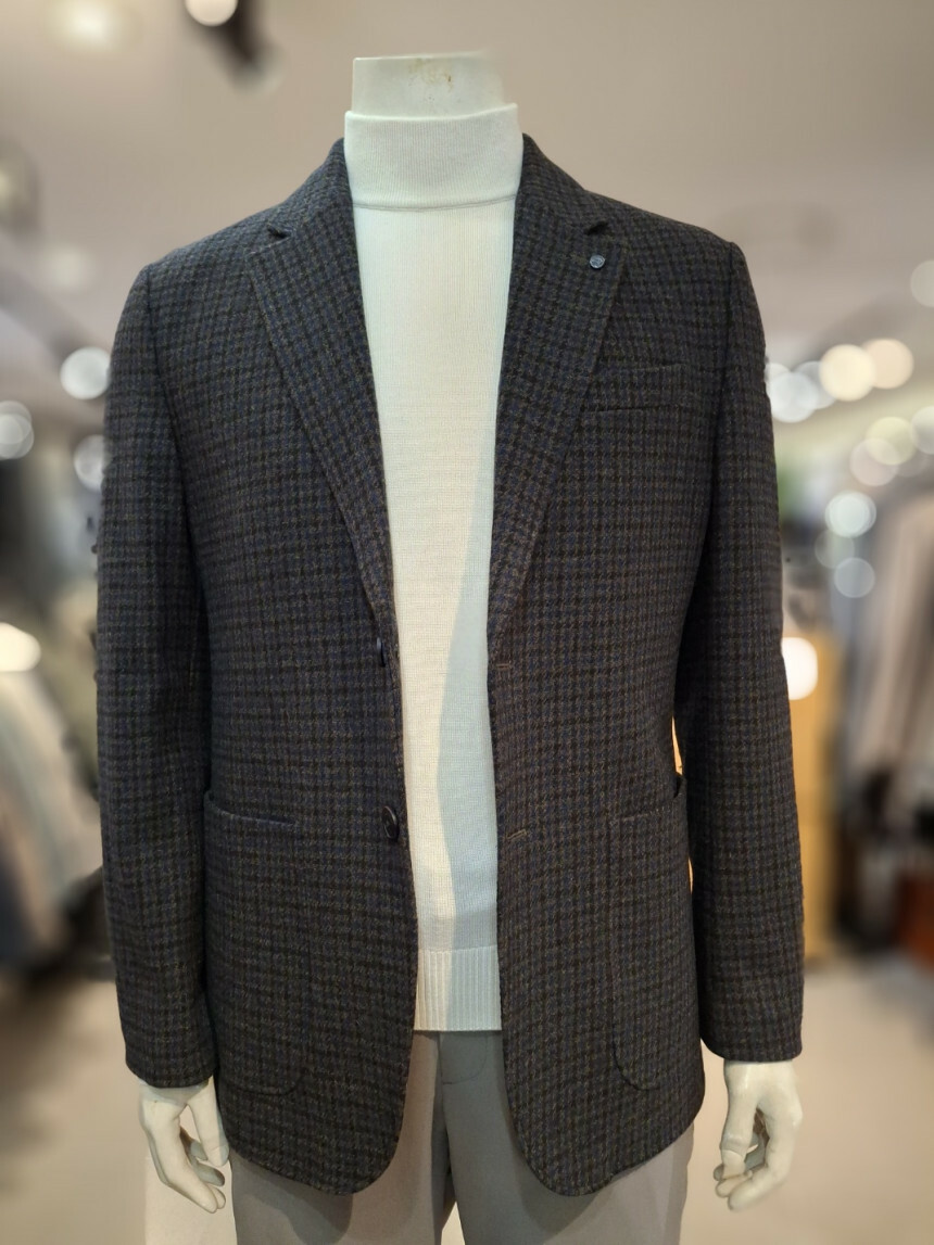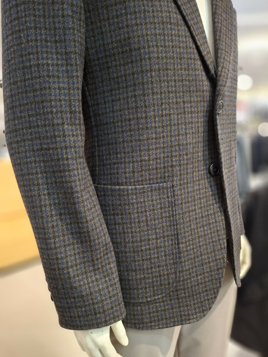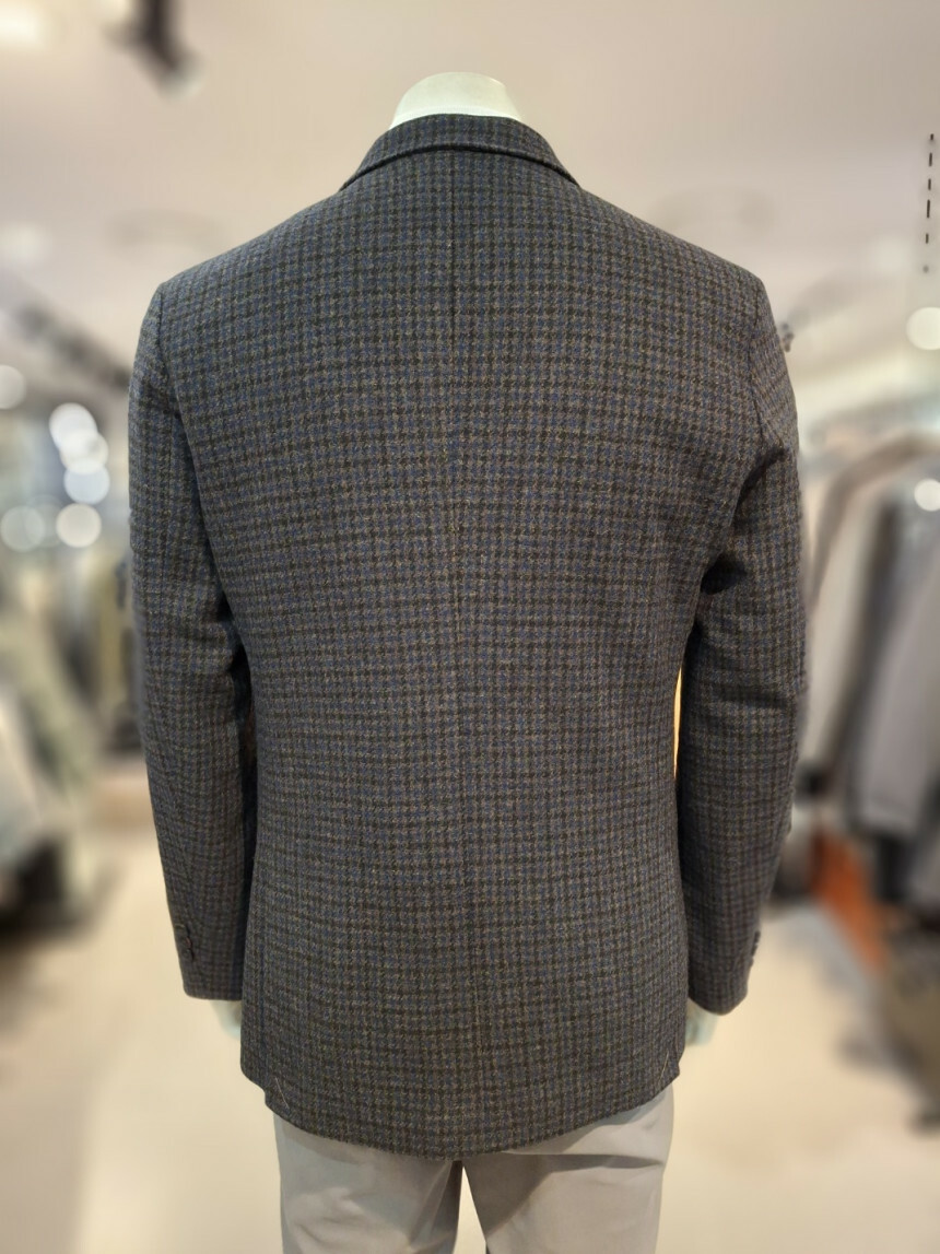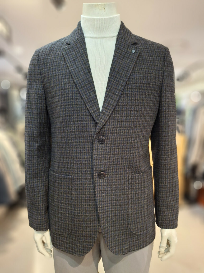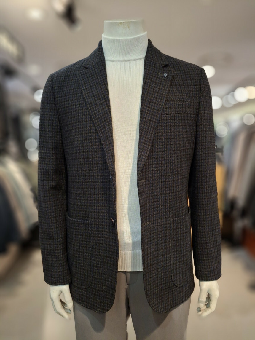 울70% , 브라운베이스에 네이비컬러 체크가 고급스러운 등판누빔 모직자켓