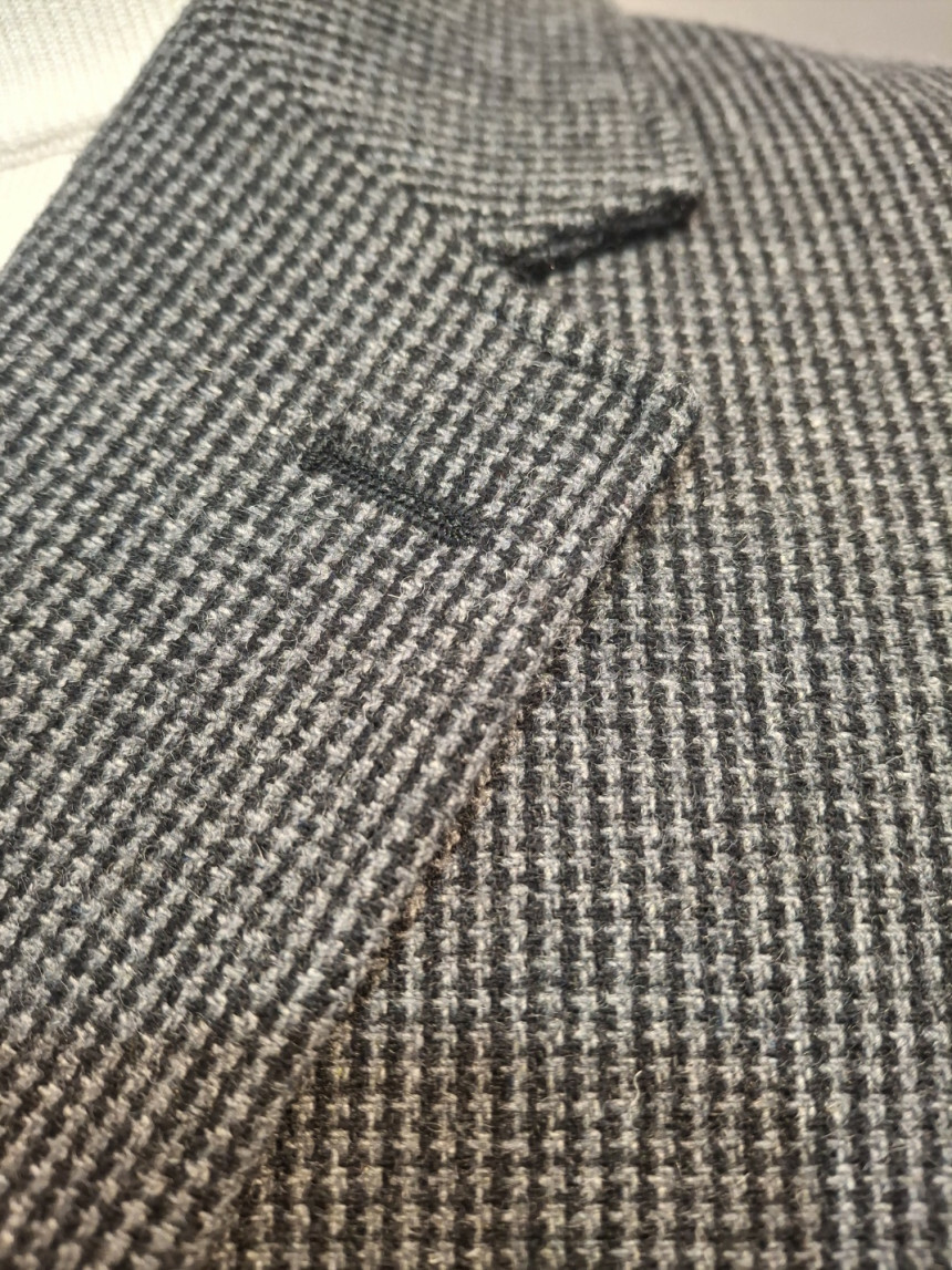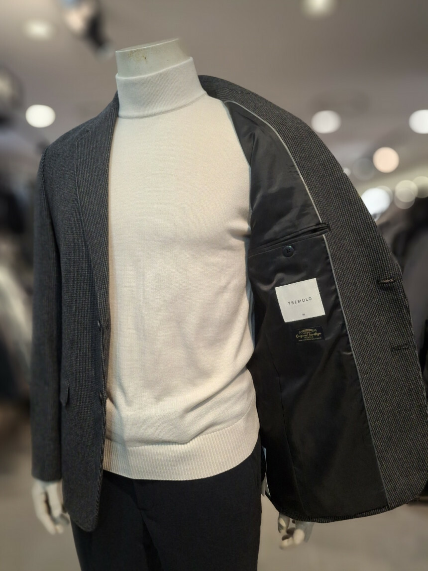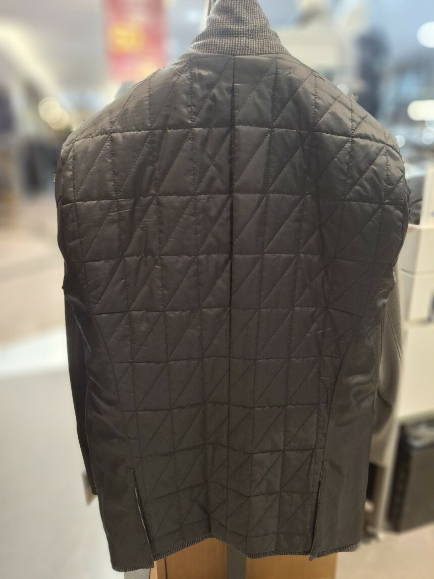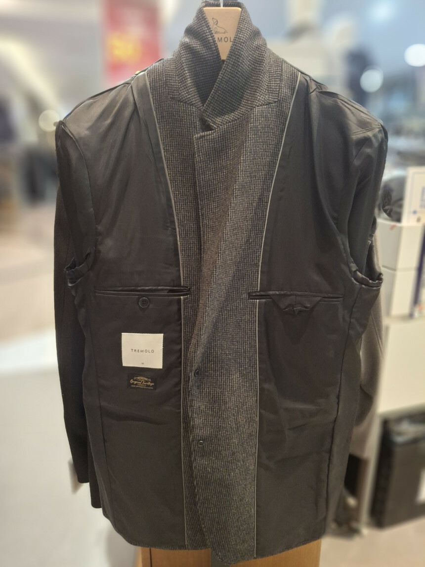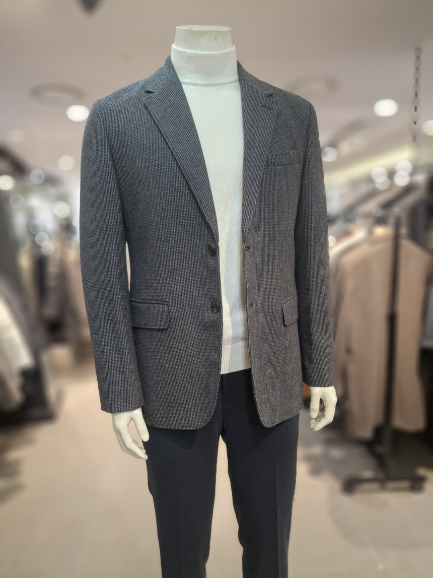 울캐시혼방으로 부드러운 차콜그레이 베이스컬러에 잔체크가 고급스러운 에어로힛 등판누빔 모직자켓
