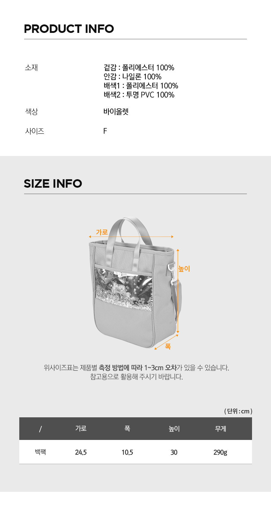 전면에는 컬러감이 뛰어나고 방수성이 좋은 PVC원단을 사용하여 반짝이 디테일을 주었습니다.