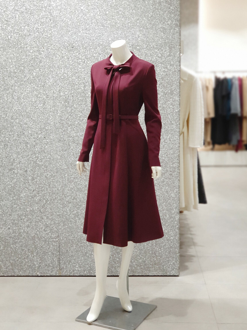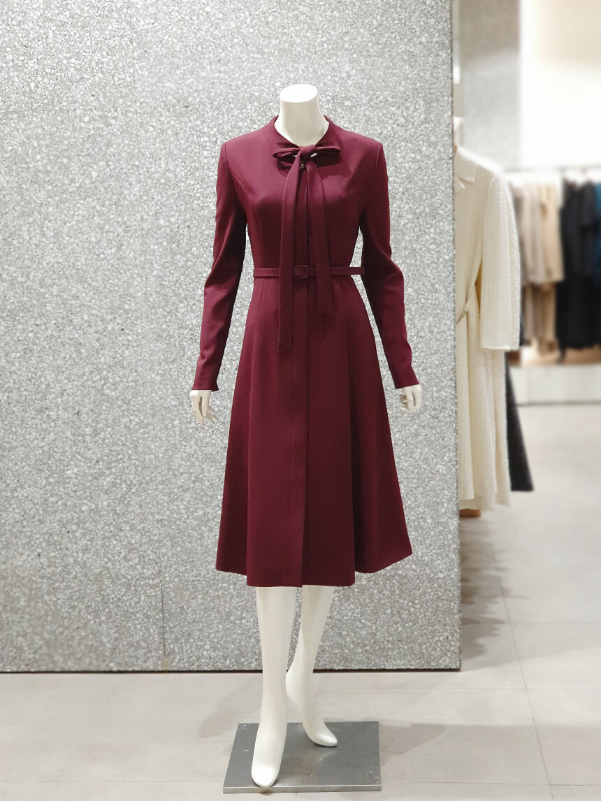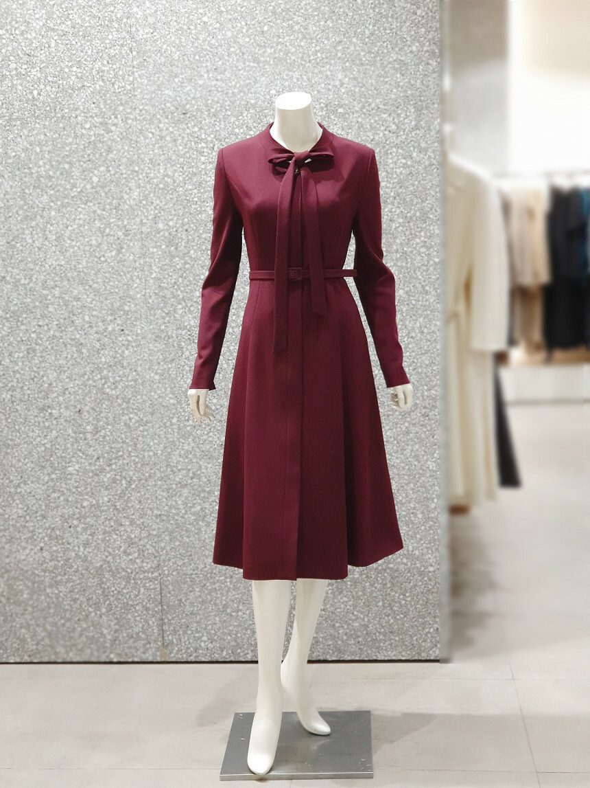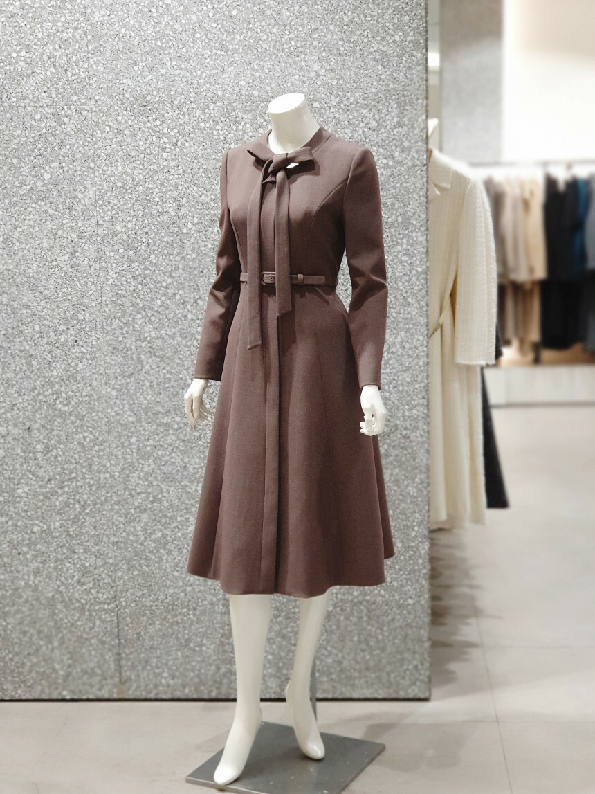 타이 넥 라인에 슬림한 허리 핏과 플레어 지는