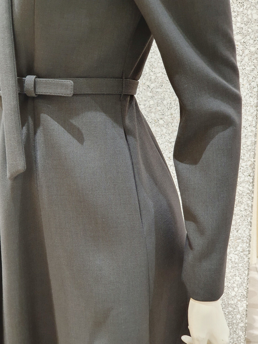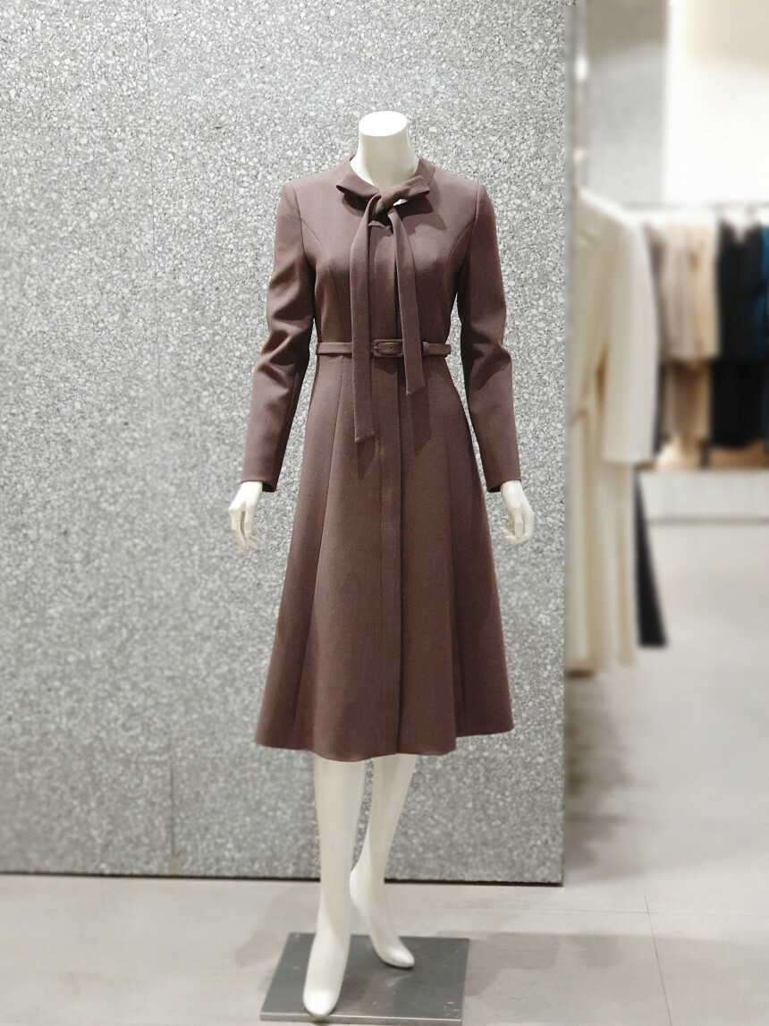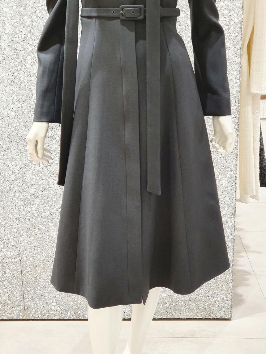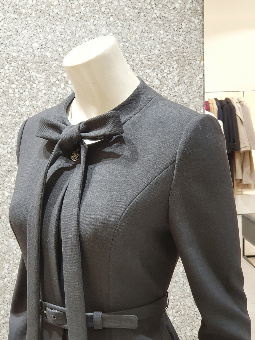 타이 넥 라인에 슬림한 허리 핏과 플레어 지는