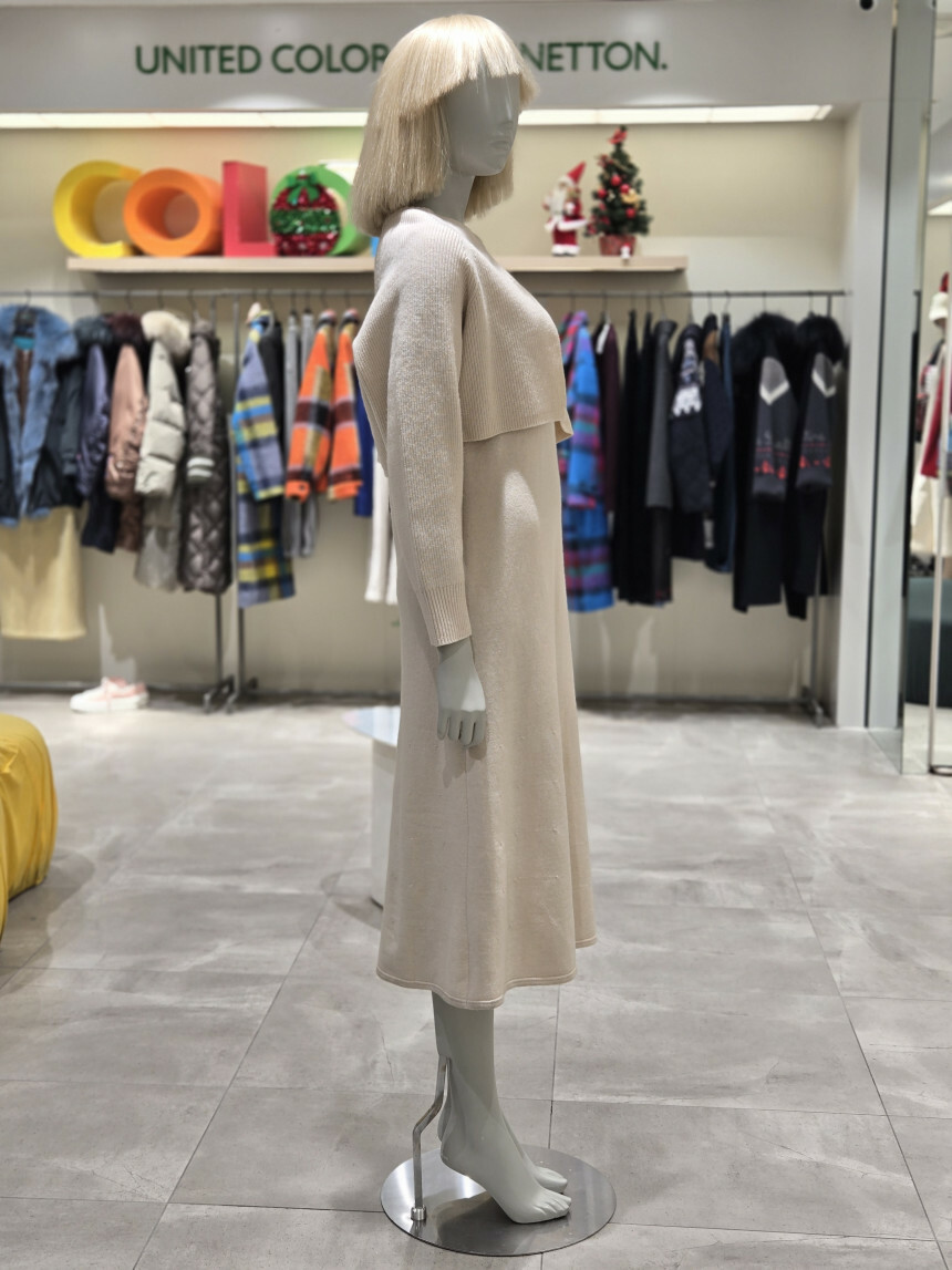 울 혼방 소재로 제안된 맥시한 기장감이 매력적인 원피스.