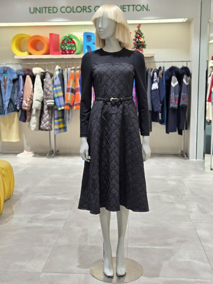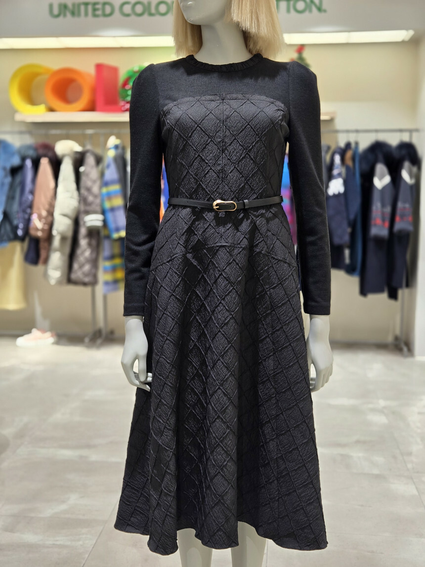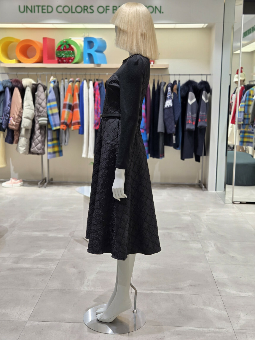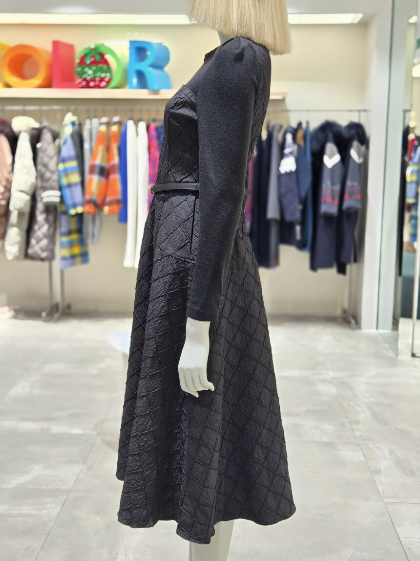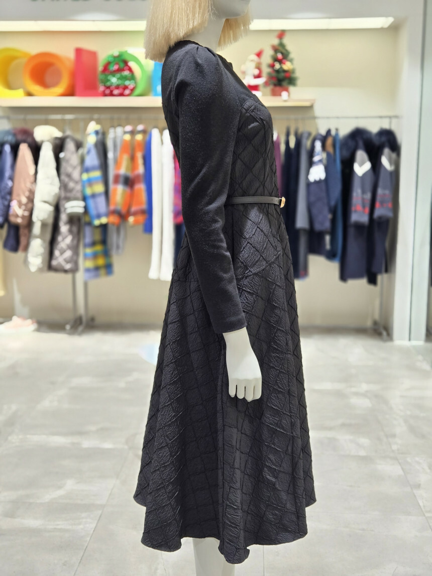 유니크한 다이아몬드 사각 퀼팅 소재로 제안된 핏앤플레어 원피스.