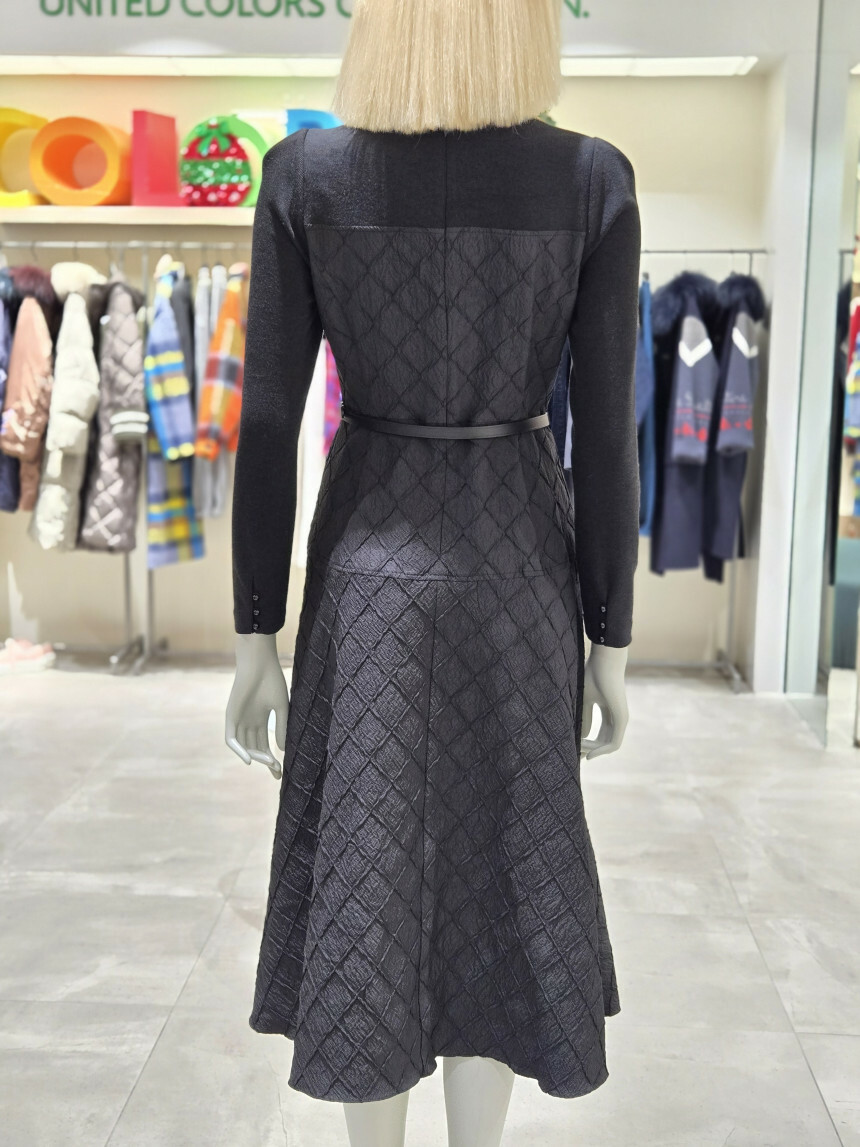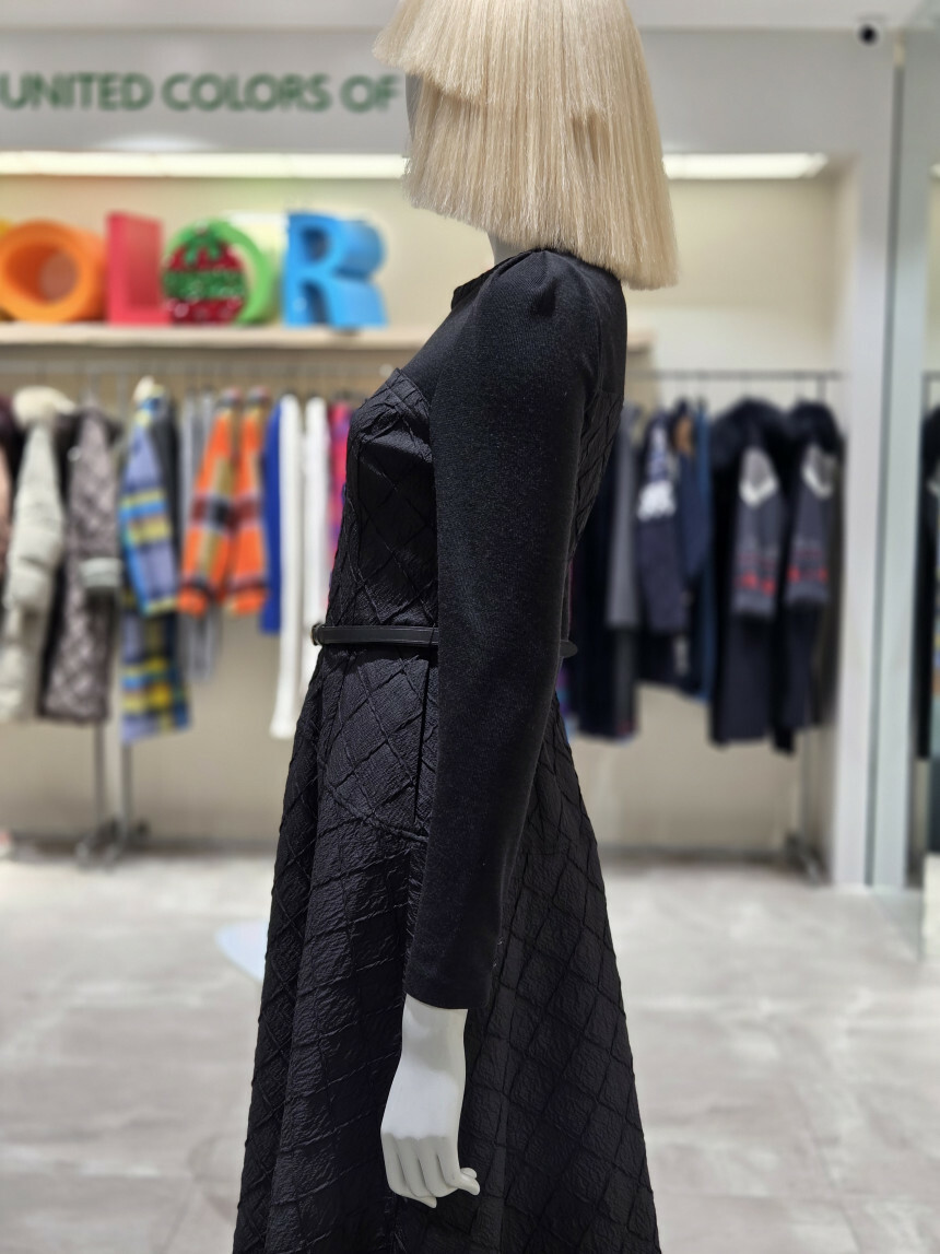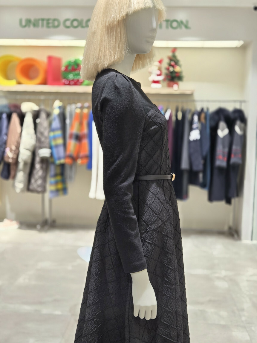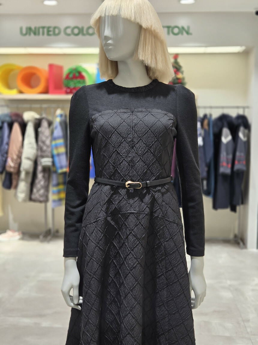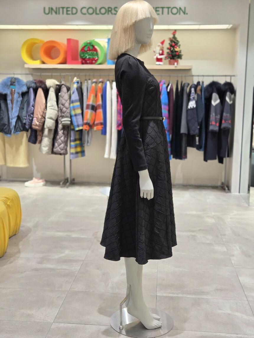 유니크한 다이아몬드 사각 퀼팅 소재로 제안된 핏앤플레어 원피스.