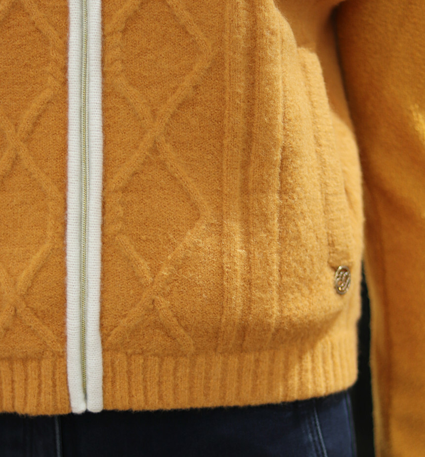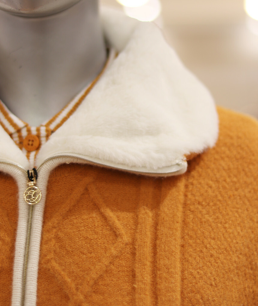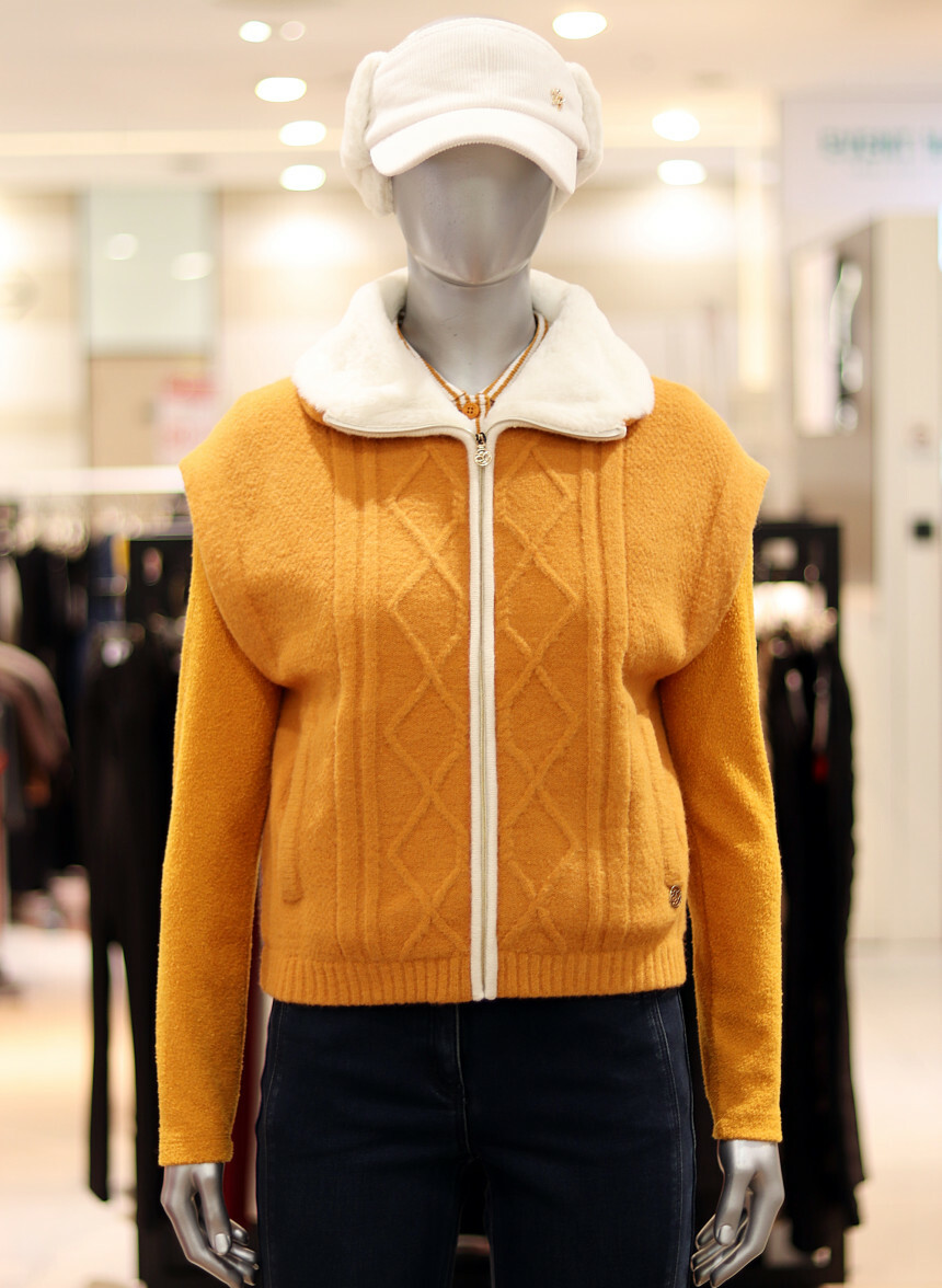 앞판 꽈배기 변형 조직과 에리 퍼 배색 디자인으로