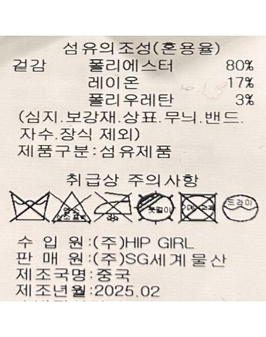 1. 제품 소재 (섬유의 조성 또는 혼용률을 백분율로 표시, 기능성인 경우 성적서 또는 허가서) 겉감-폴리에스터80% 레이온17% 폴리우레탄3%