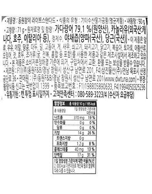 1. 제품명 | 동원참치 라이트스탠다드 |