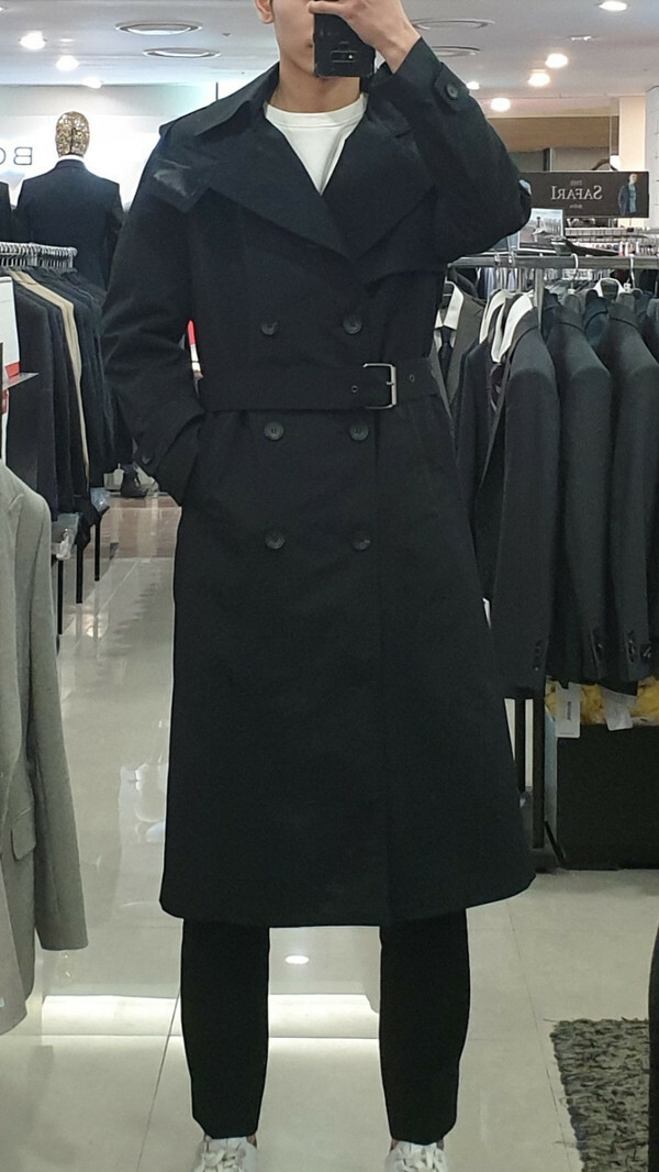 블랙 컬러의 더블 벨티드 후드 트렌치코트입니다.