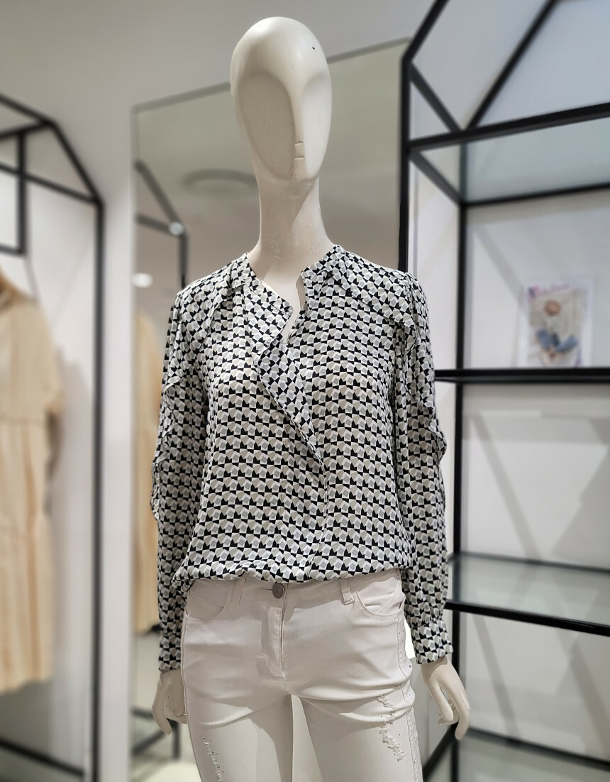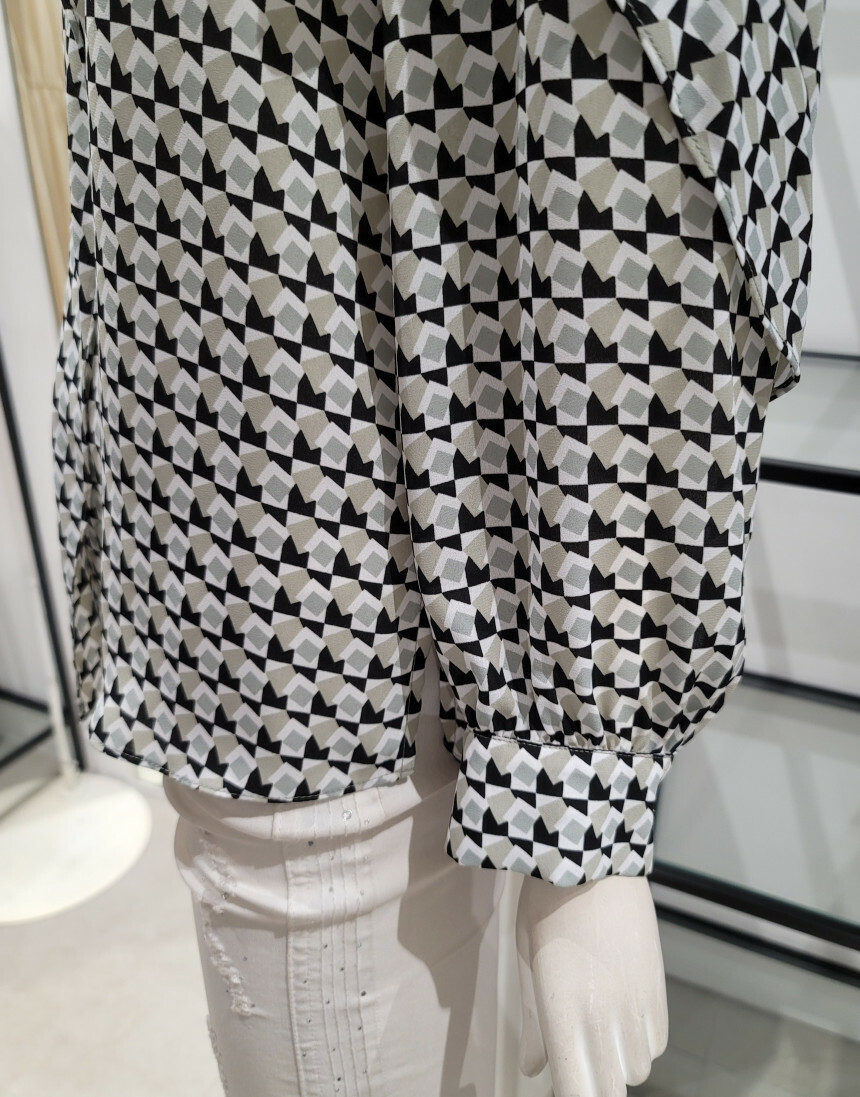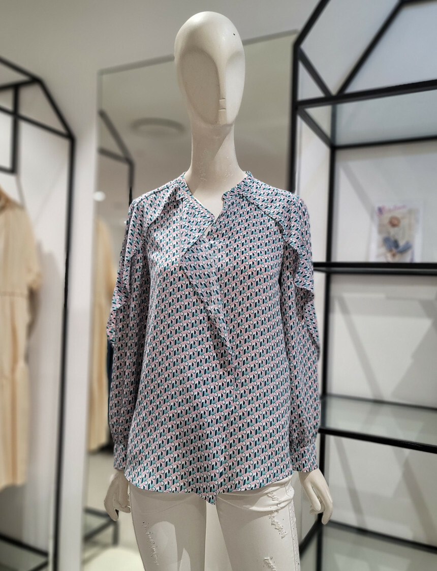 스타일링Tip하늘하늘한 쉬폰소재로 깔끔하게 떨어지는 핏감이 예쁘고기하학패턴 러플 포인트로여성스럽고 고급스러운아이템 입니다