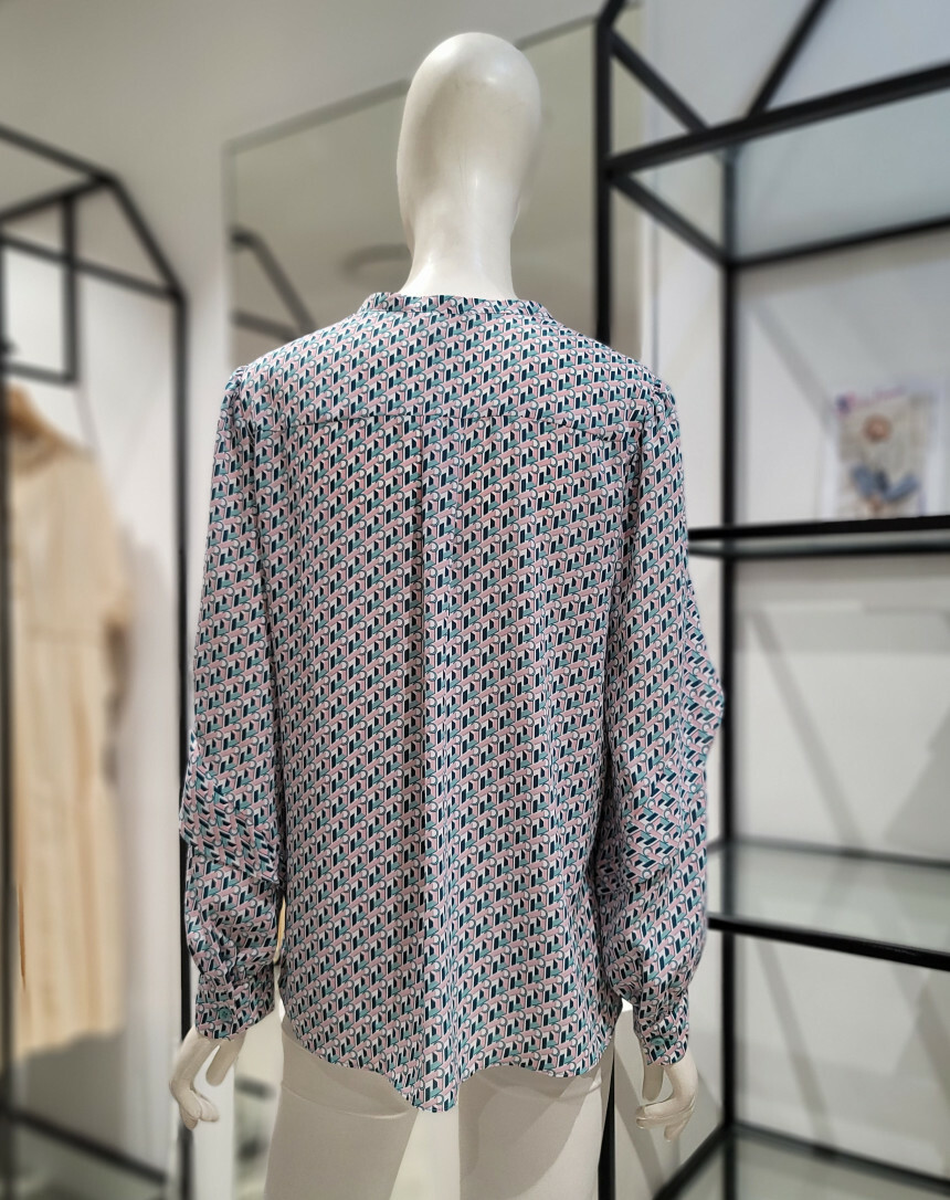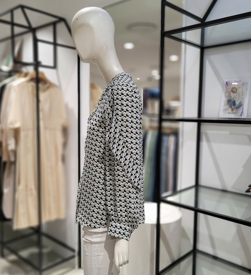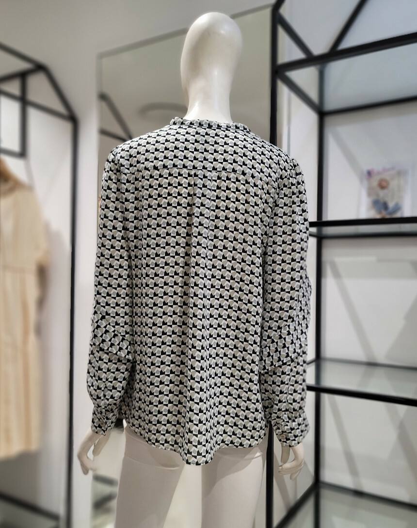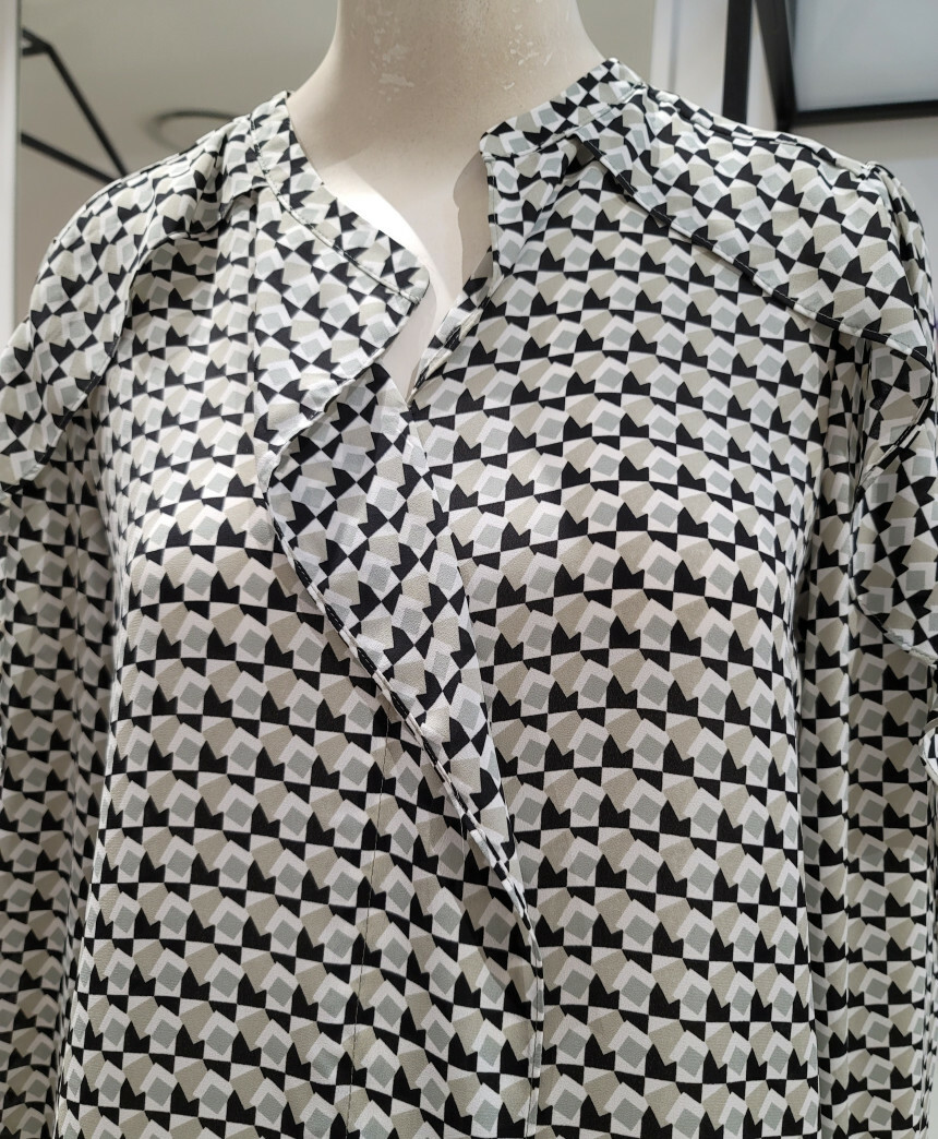 스타일링Tip하늘하늘한 쉬폰소재로 깔끔하게 떨어지는 핏감이 예쁘고기하학패턴 러플 포인트로여성스럽고 고급스러운아이템 입니다