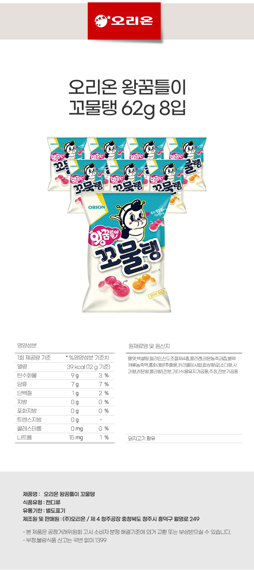해당 상품은 [오리온 왕꿈틀이 꼬물탱 62g 8입 (496g) ] 구성의 상품입니다.