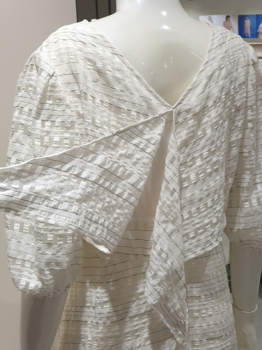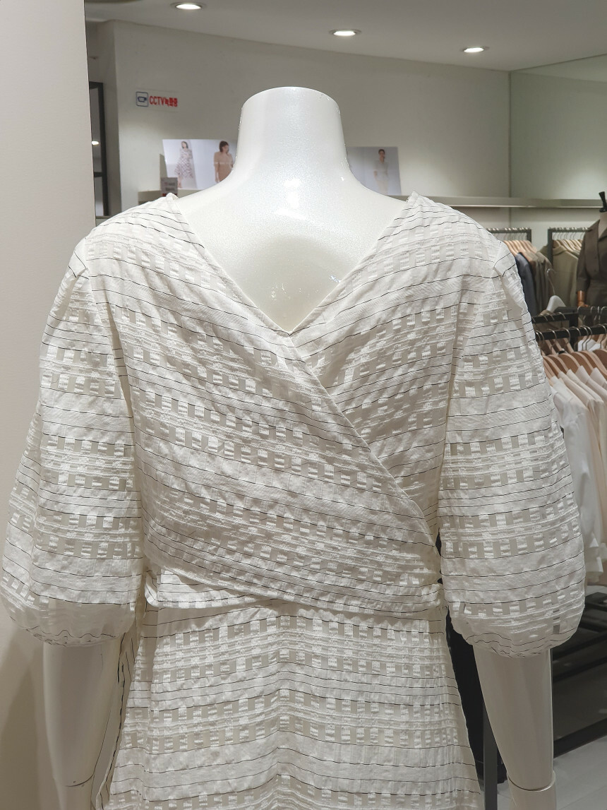 퍼프소매 디테일과 랩 디자인의 허리 끈으로 포인트를 주고