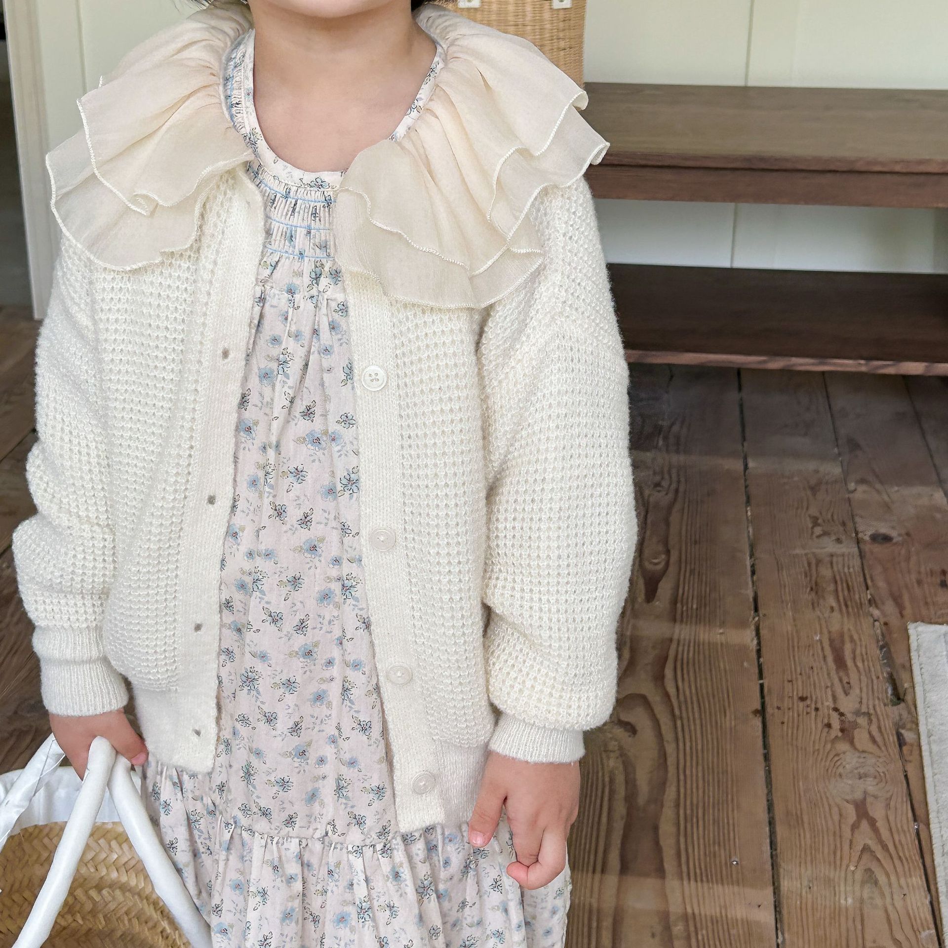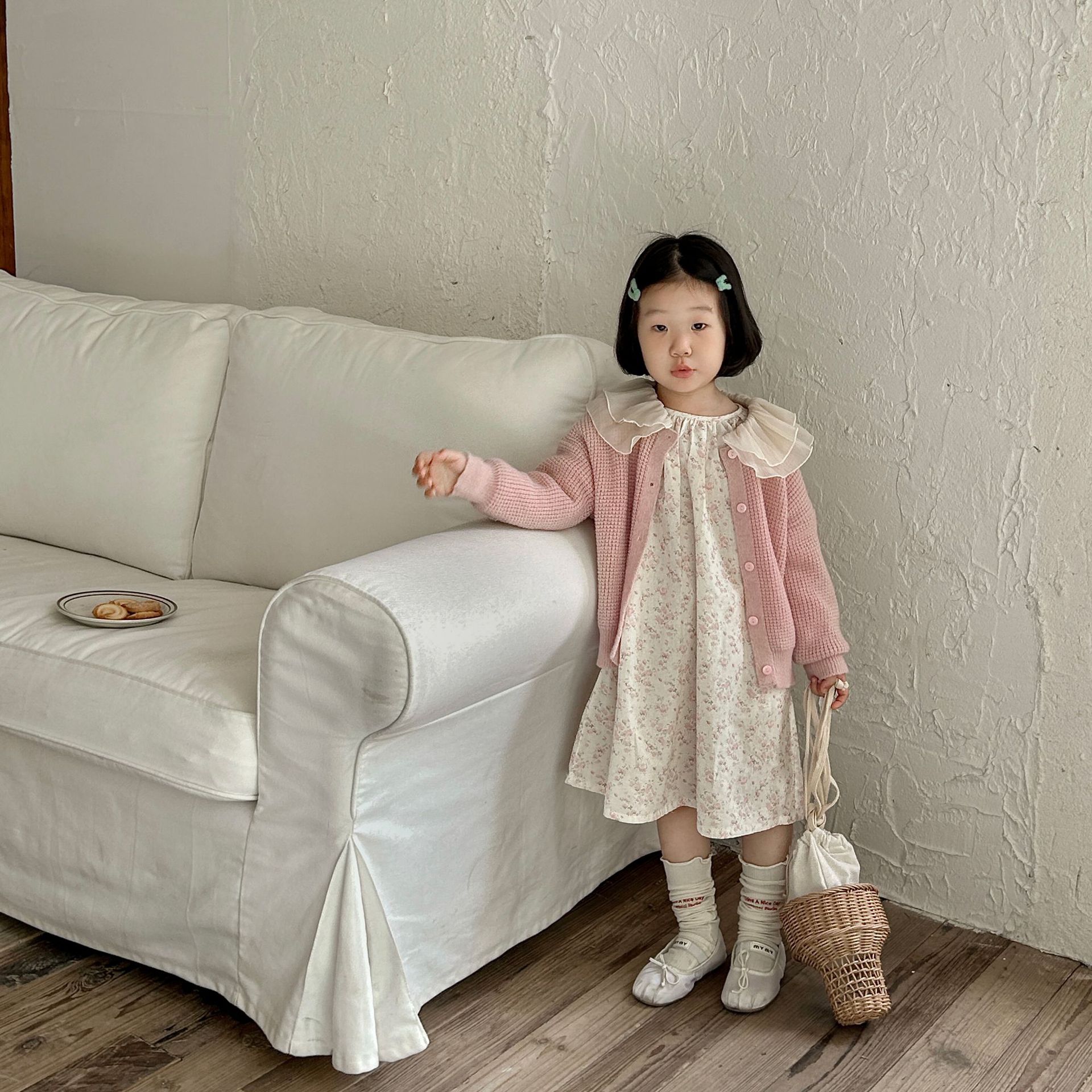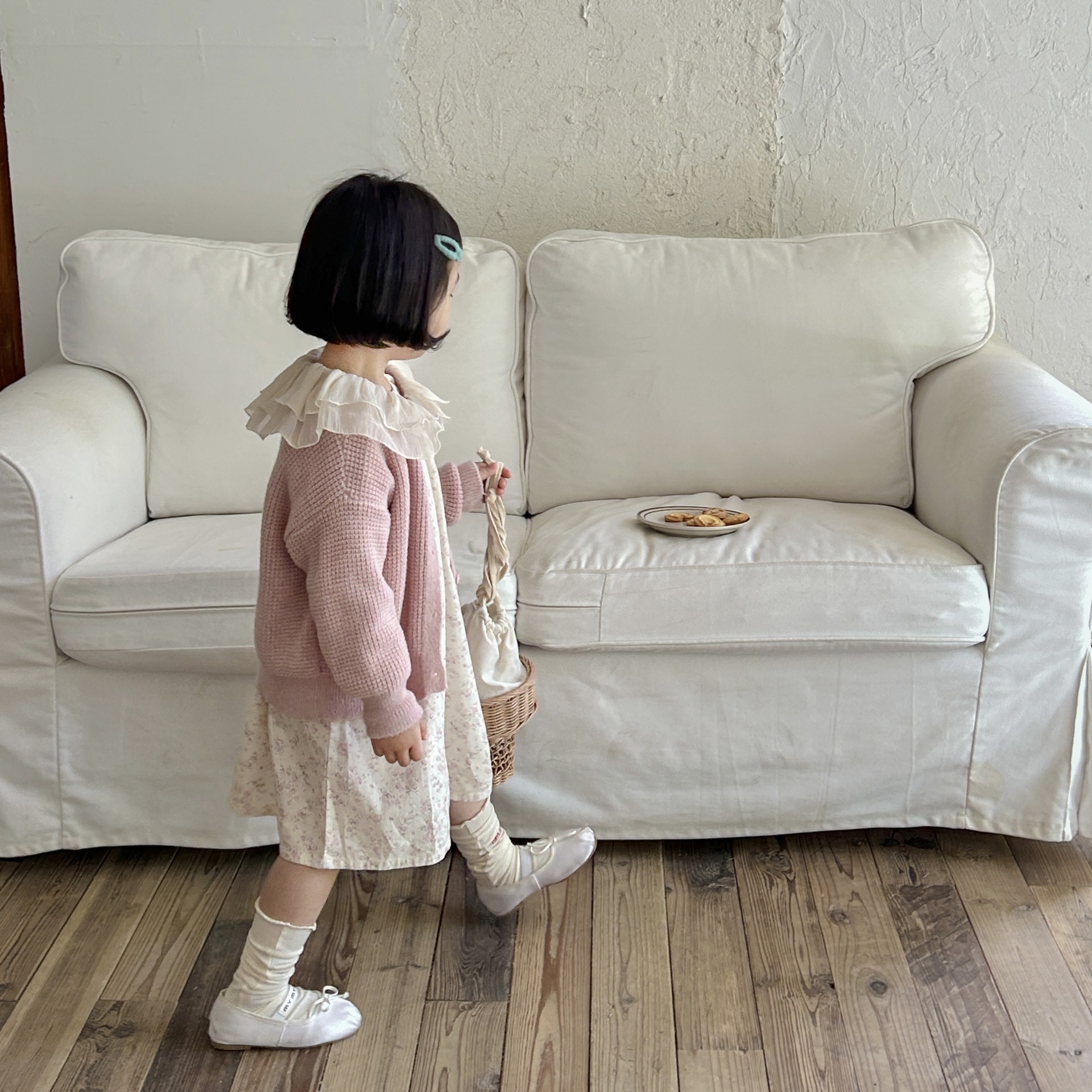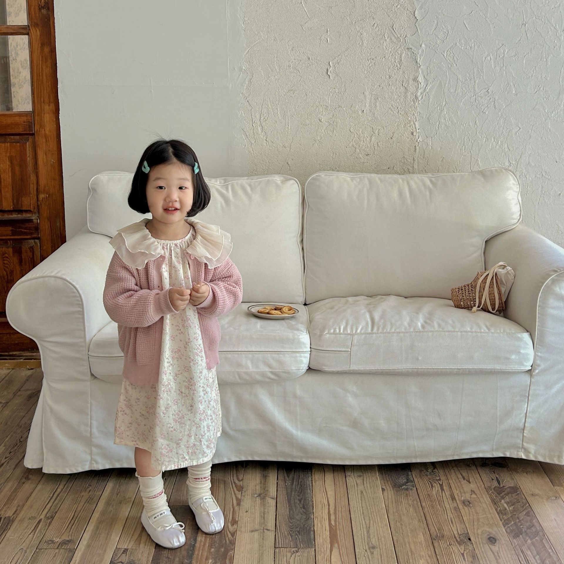 루아 쉬폰 카라 니트 가디건 R9641 색상 : 아이보리, 핑크 사이즈 : 100,110,120,130,140 소재 : 면 기타 사용연령: 37개월이상