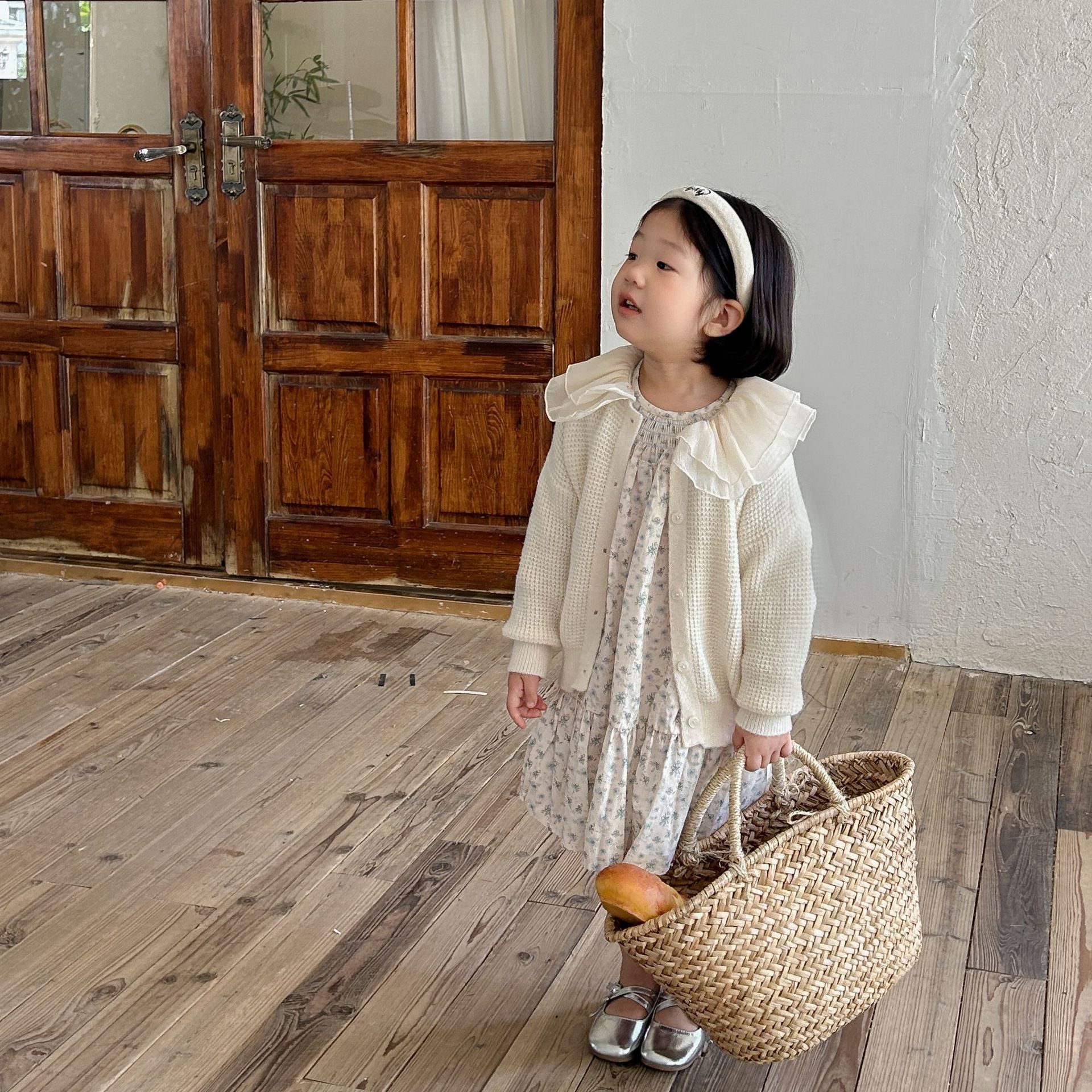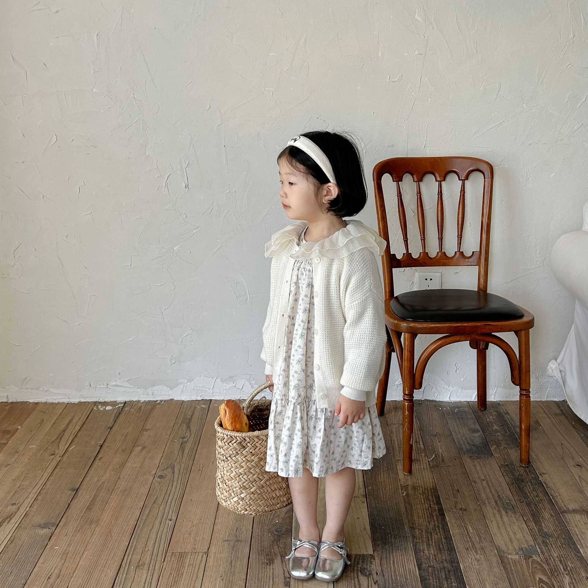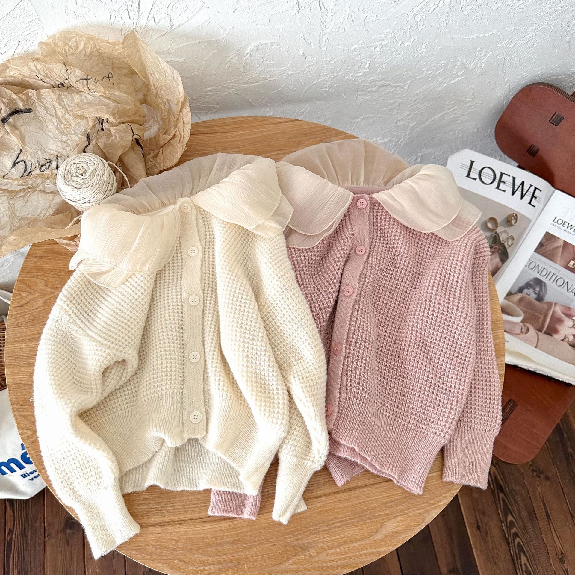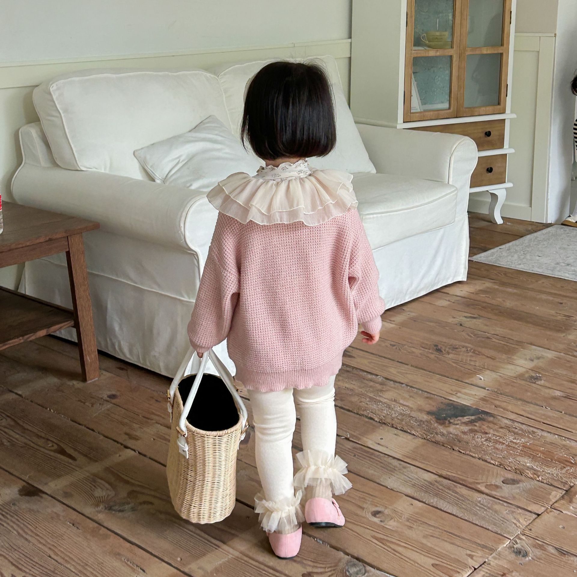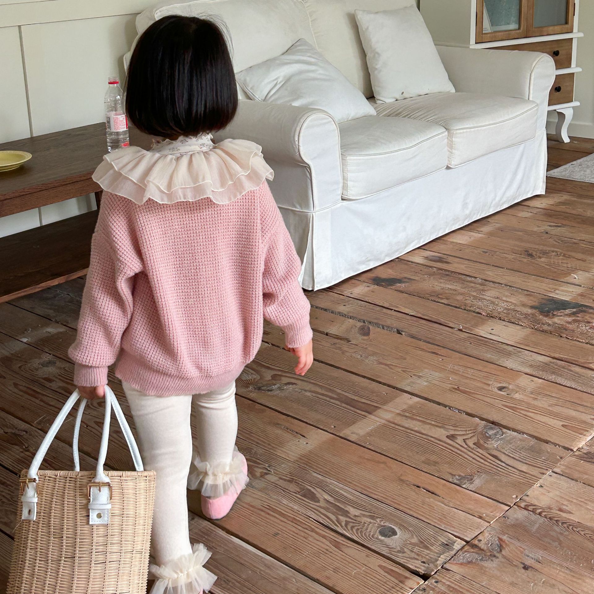 루아 쉬폰 카라 니트 가디건 R9641 색상 : 아이보리, 핑크 사이즈 : 100,110,120,130,140 소재 : 면 기타 사용연령: 37개월이상