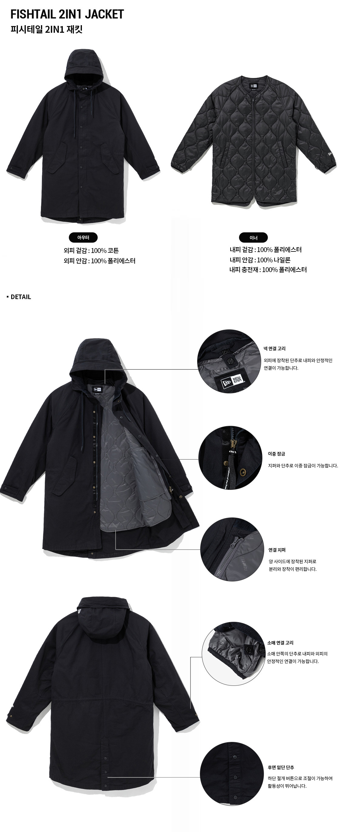 미군 M-51 파카에서 영감을 받아 디자인한 피시테일 2IN1 재킷 컬렉션을 소개합니다. 2IN1 재킷으로 제작되어 아우터와 이너가 탈부착이 가능합니다. 퀼팅 기법으로 제작된 이너에 충전재가 내장되어 있어 단독으로도 착용이 가능하며, 아우터는 버튼과 지퍼를 통한 이중 잠금과 하이넥 디자인으로 차가운 바람을 단단히 막아주며, 소매에는 밴딩 처리가 되어 있으며 겉감에도 소매 부분에 버튼이 부착되어 있어 조절이 가능합니다. 포켓 역시 버튼을 부작하여 작은 물건을 소지하기에 안정감이 있으며, 겉감의 투웨이 지퍼와 후면부 하단 절개 버튼 디테일로 활동성을 더했으며 후드 모자 가장자리 부분에 내장된 와이어로 활동에 따라 다양하게 변형하여 착용이 가능합니다. 뛰어난 보온성과 다양한 기능, 밀리터리 감성을 자극하는 피시테일 2IN1 재킷은 스톤과 울트라 네이비 두 가지 컬러로 만나보실 수 있습니다.
