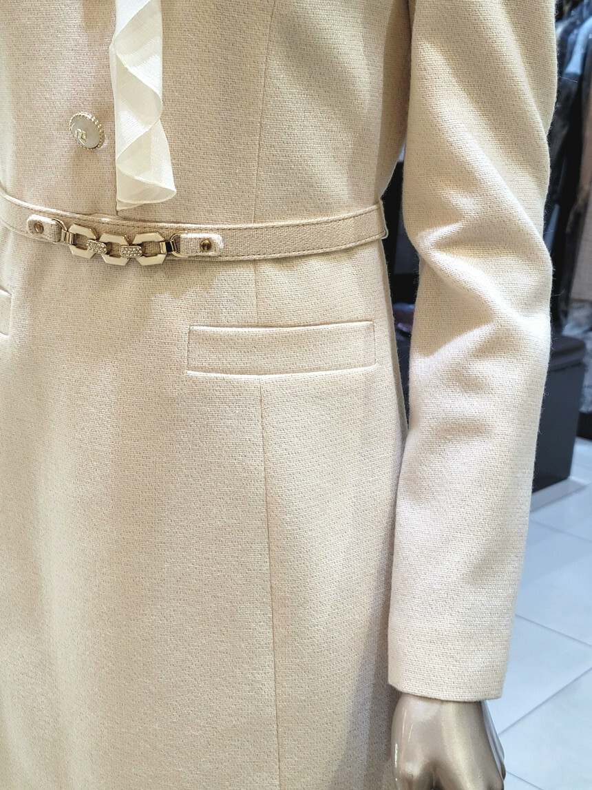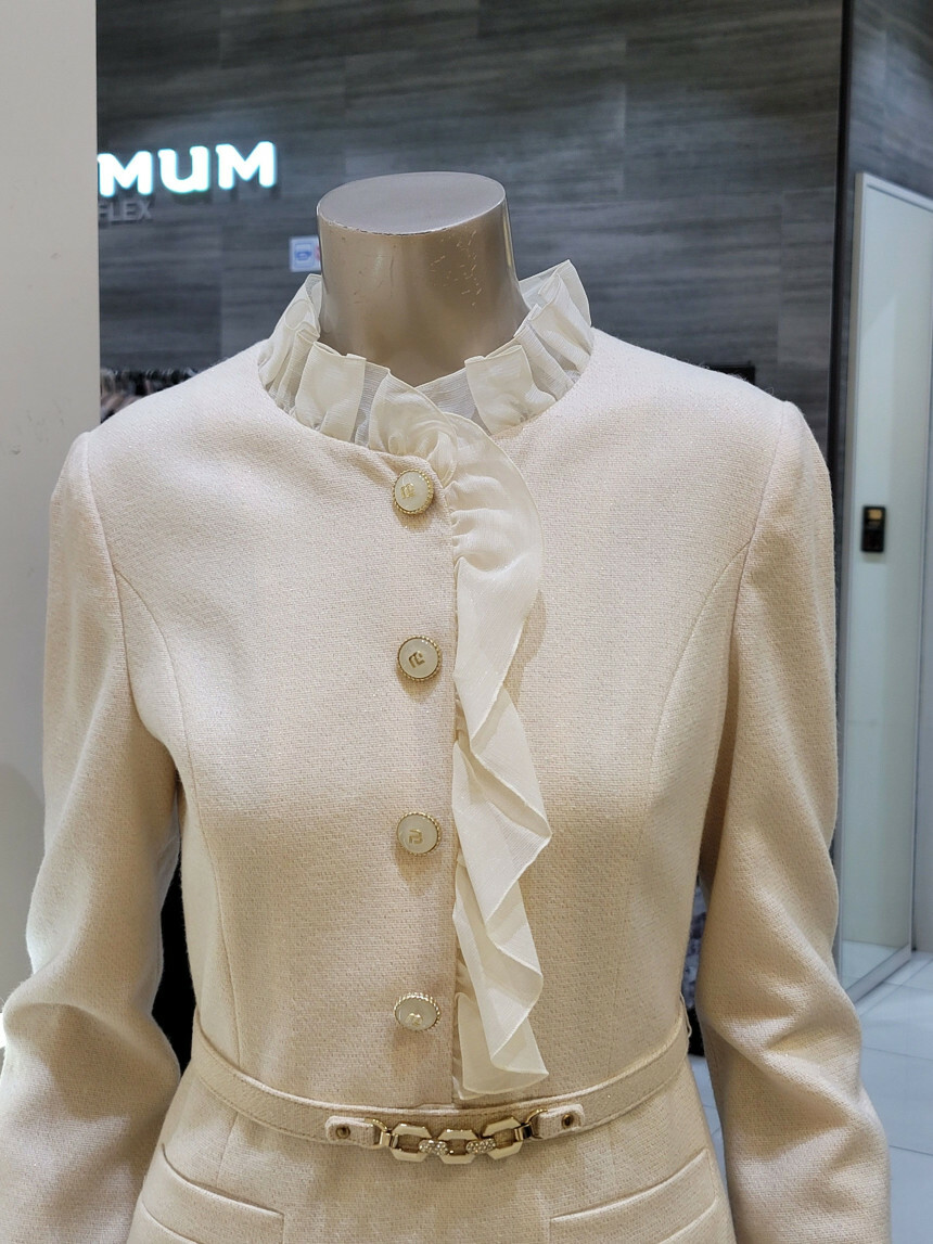 네크라인에서 프런트로 이어지는 배색 프릴 장식으로