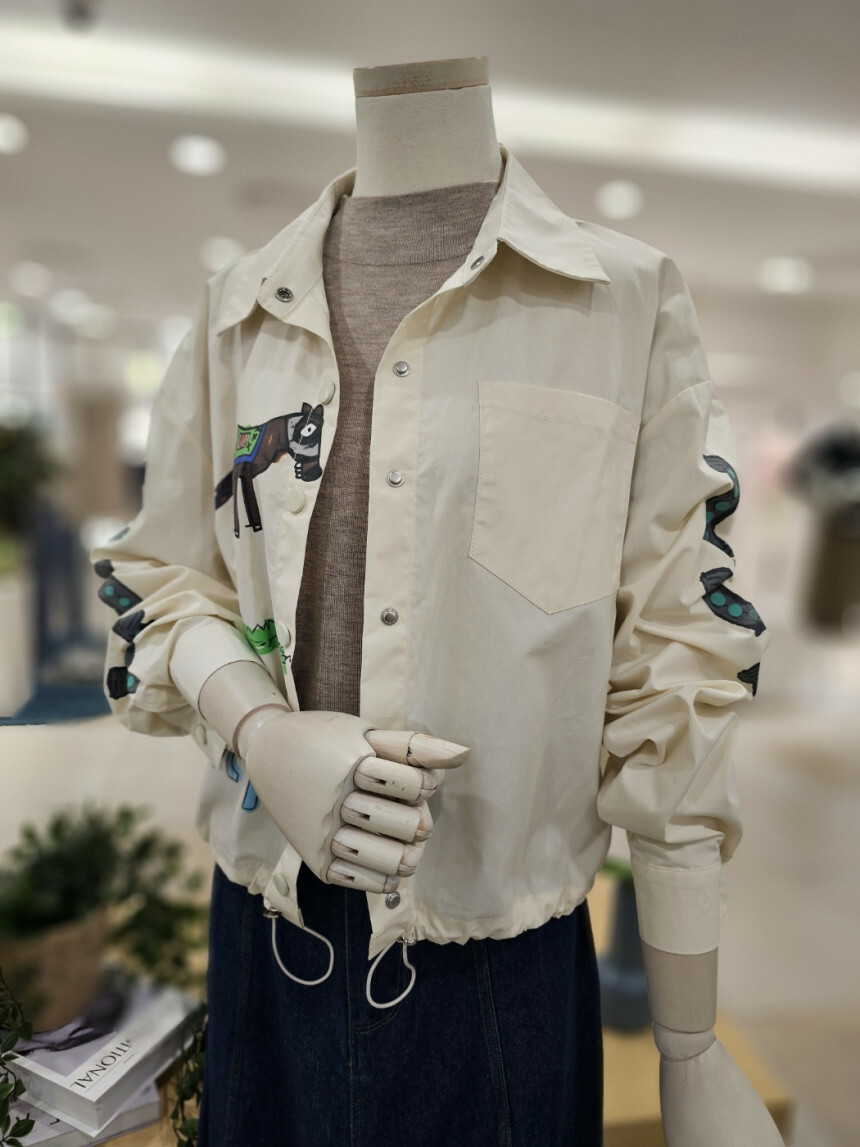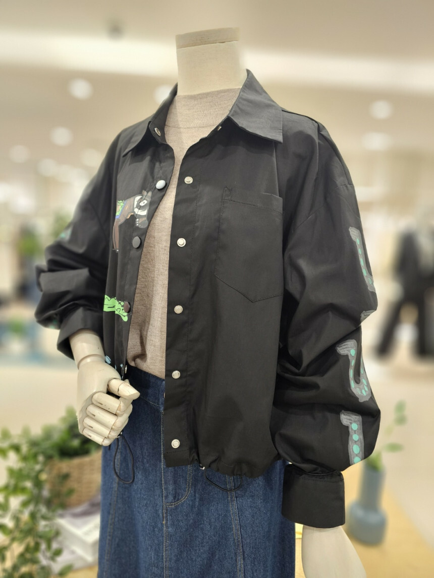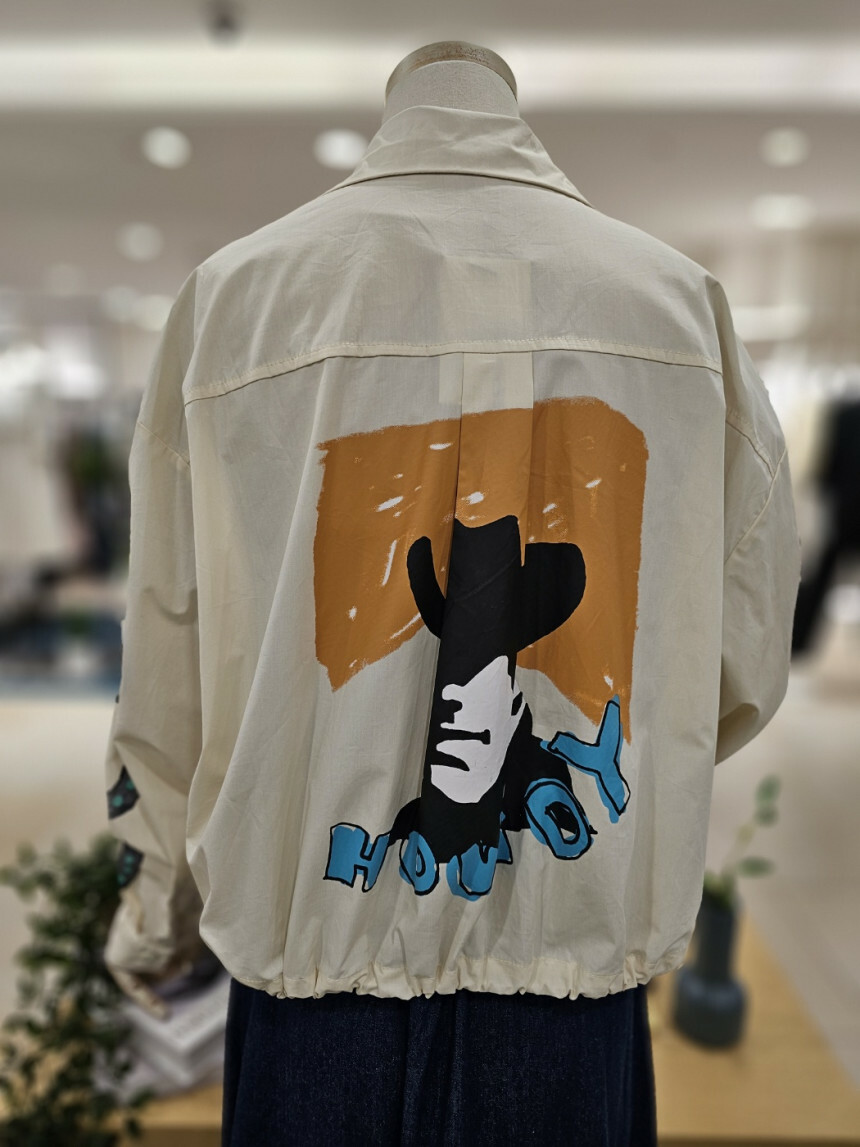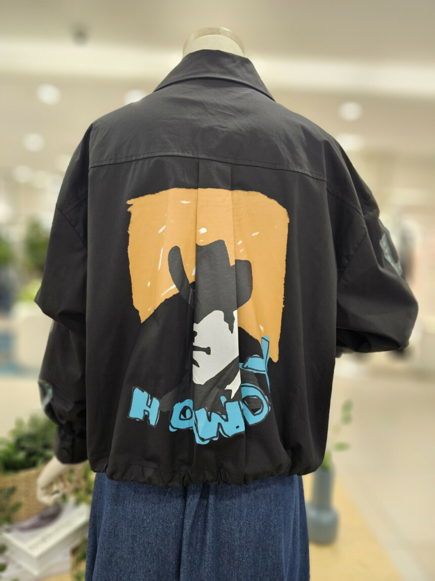 이지한 가을 점퍼입니다. 앞뒤 프린트가 세련미를 더해주고 밑단 스트링 구성으로