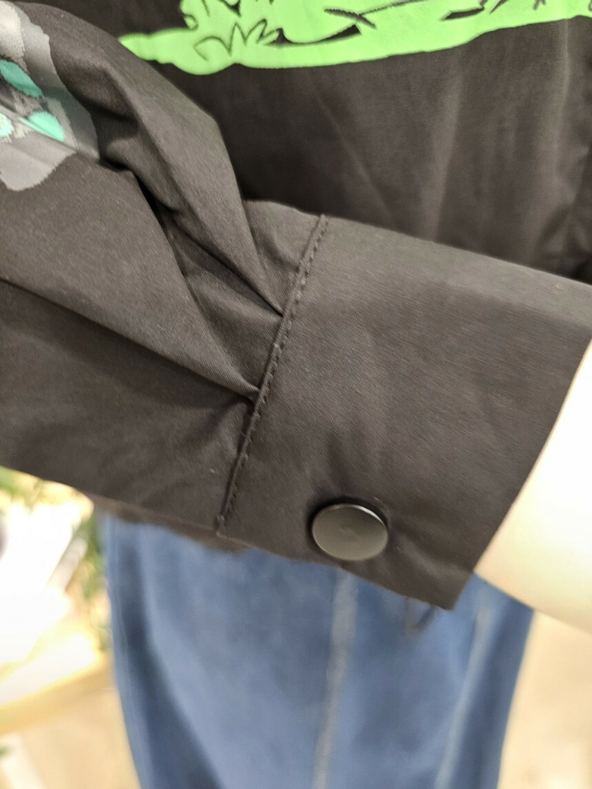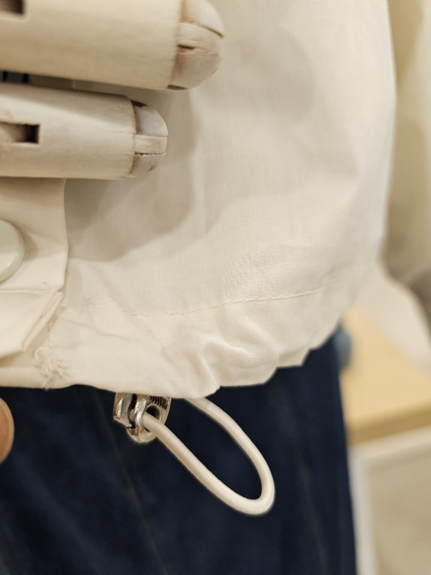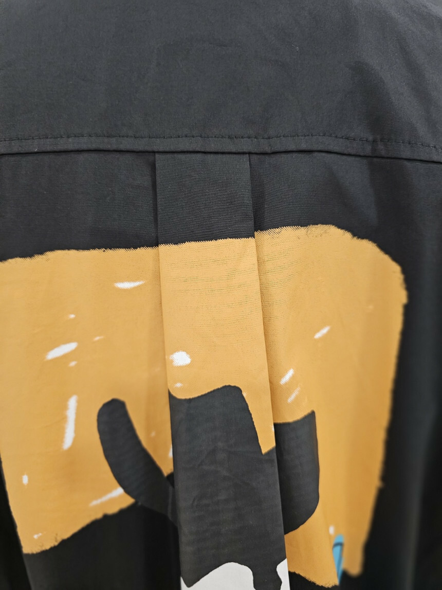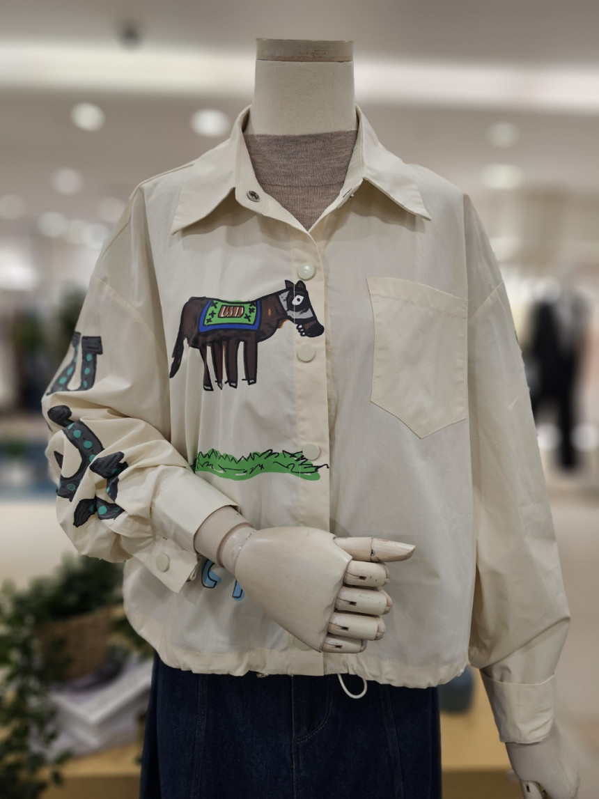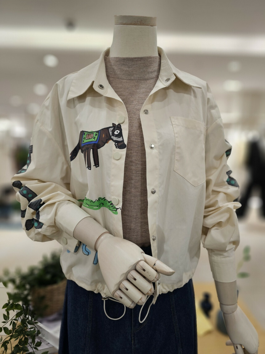 이지한 가을 점퍼입니다. 앞뒤 프린트가 세련미를 더해주고 밑단 스트링 구성으로