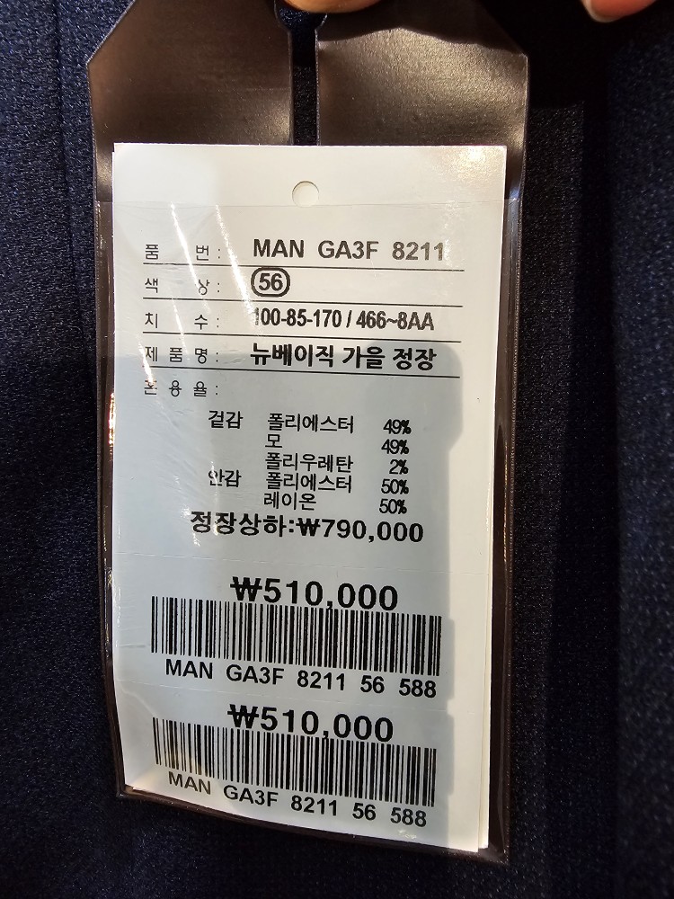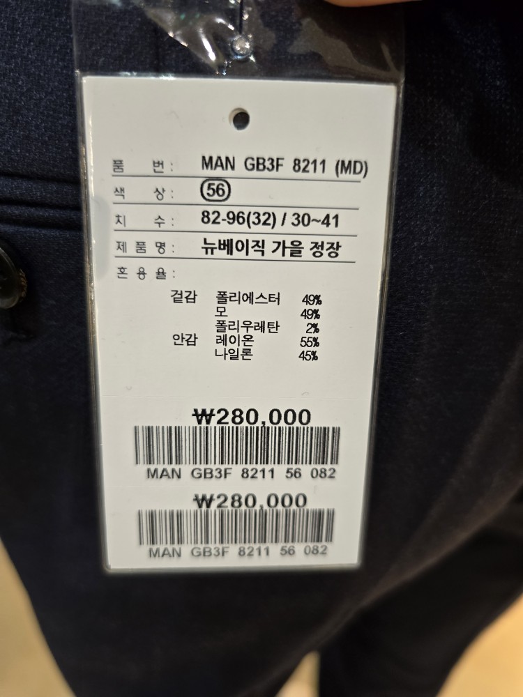 겉감 : 폴리에스터49% 모 49% 폴리우레탄2%