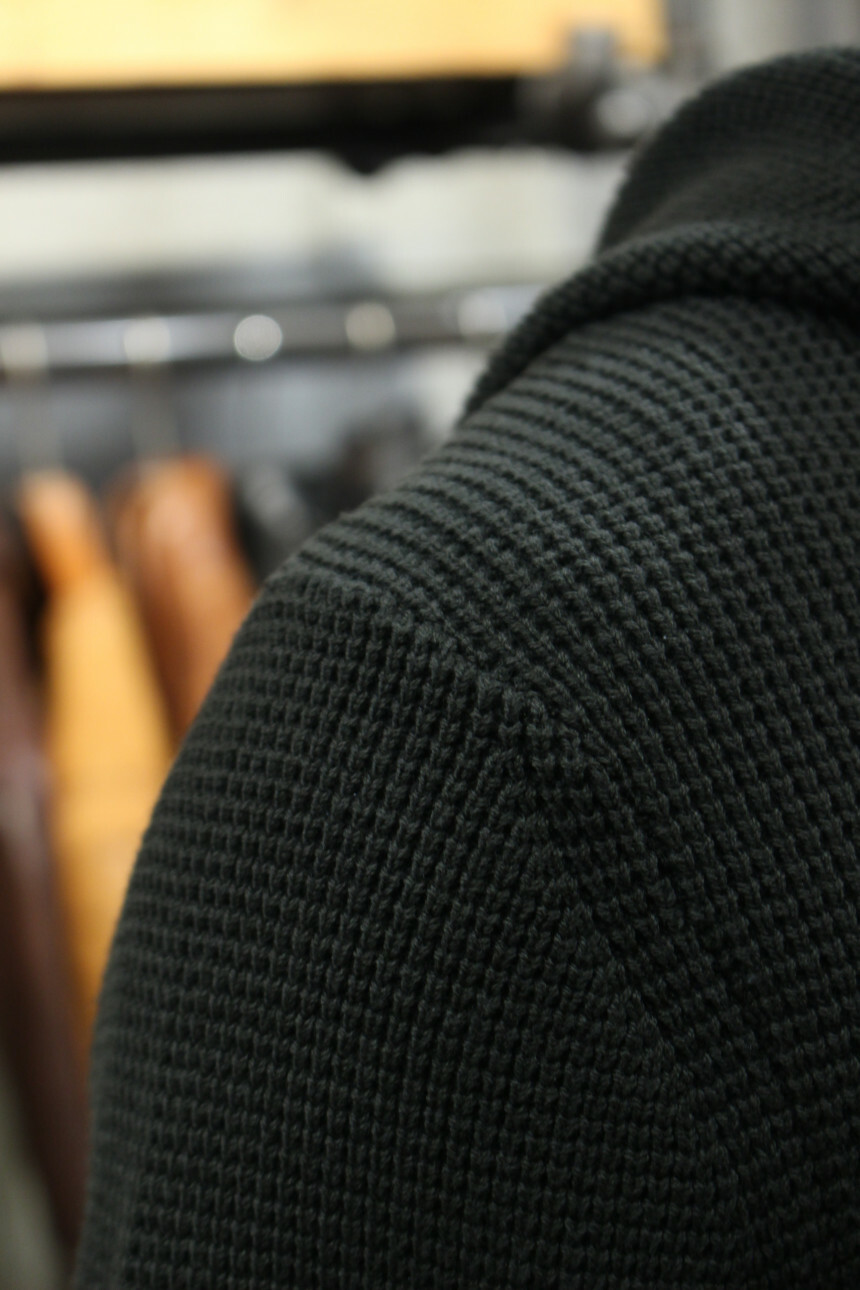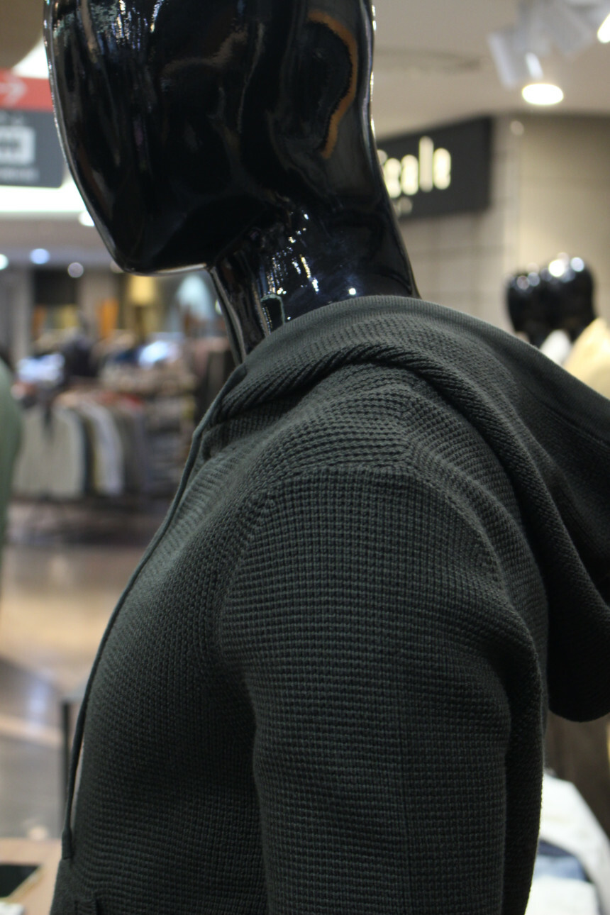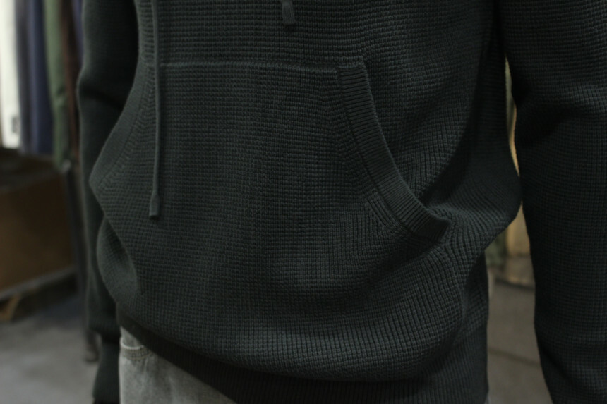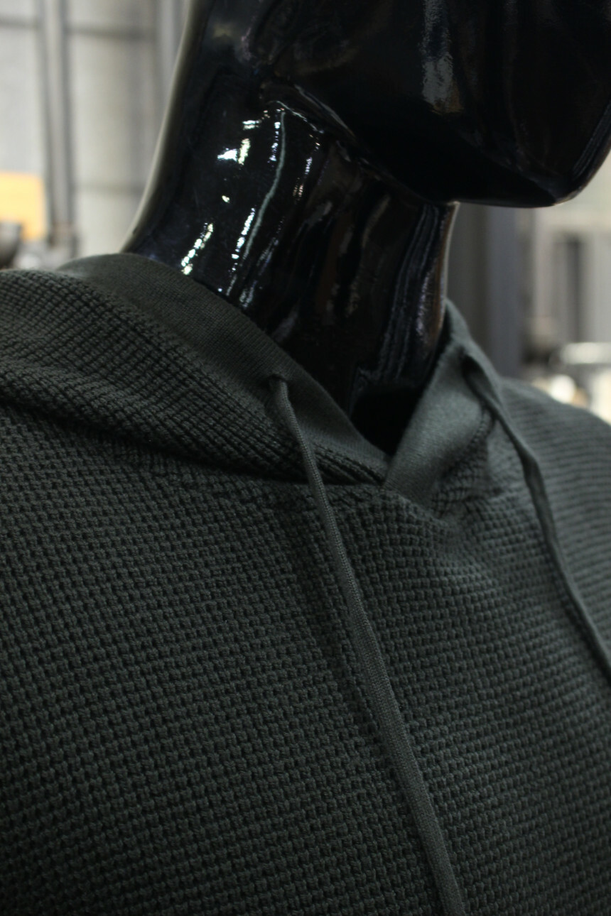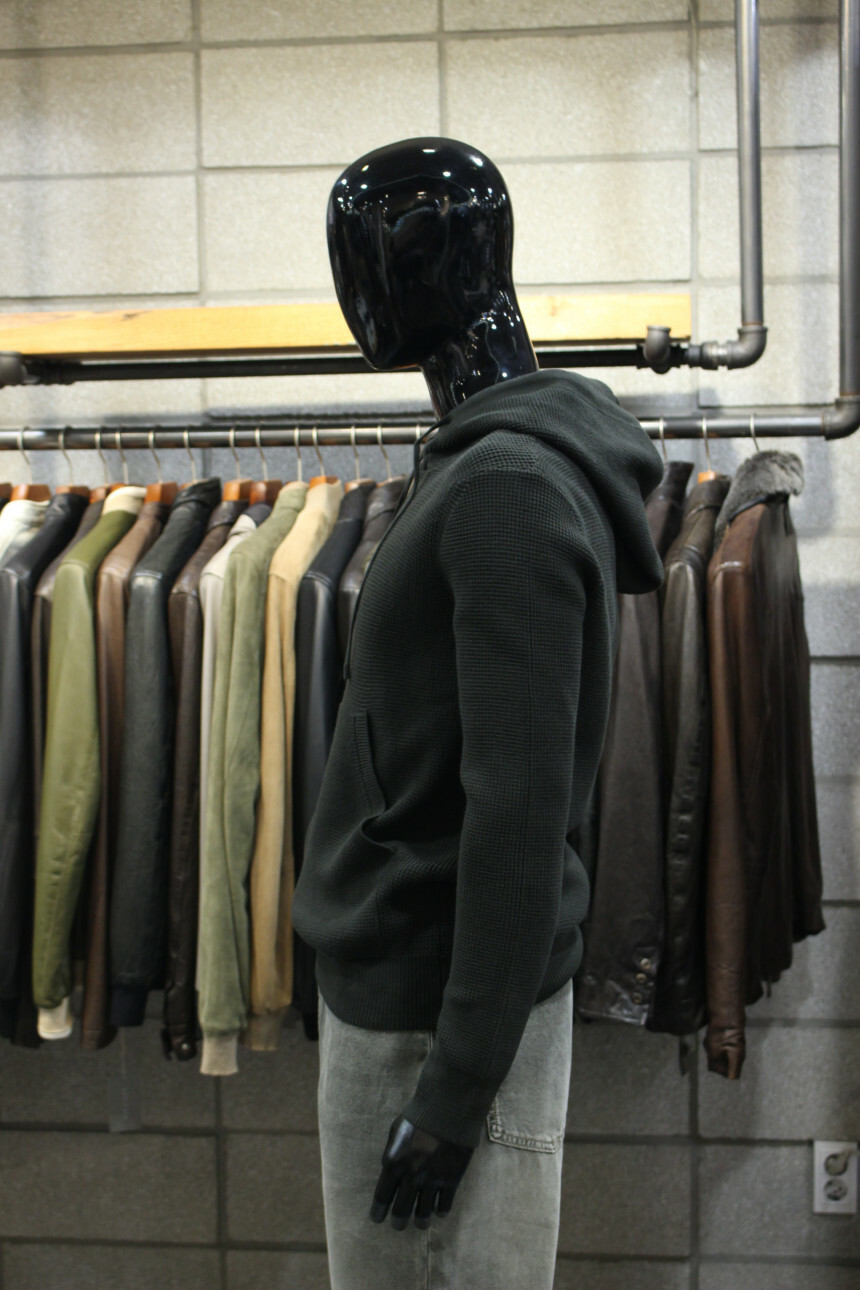 카키컬러의 와플조직면니트로 신축성이 좋아 슬림하면서도 비교적 편안한 느낌입니다
