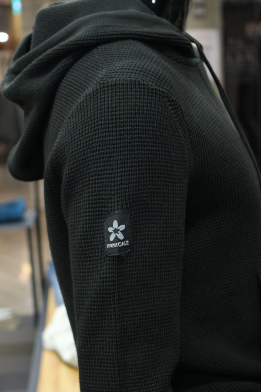후드일체형에 스트링이 있으며 한쪽팔에 로고와펜포인트가 있습니다