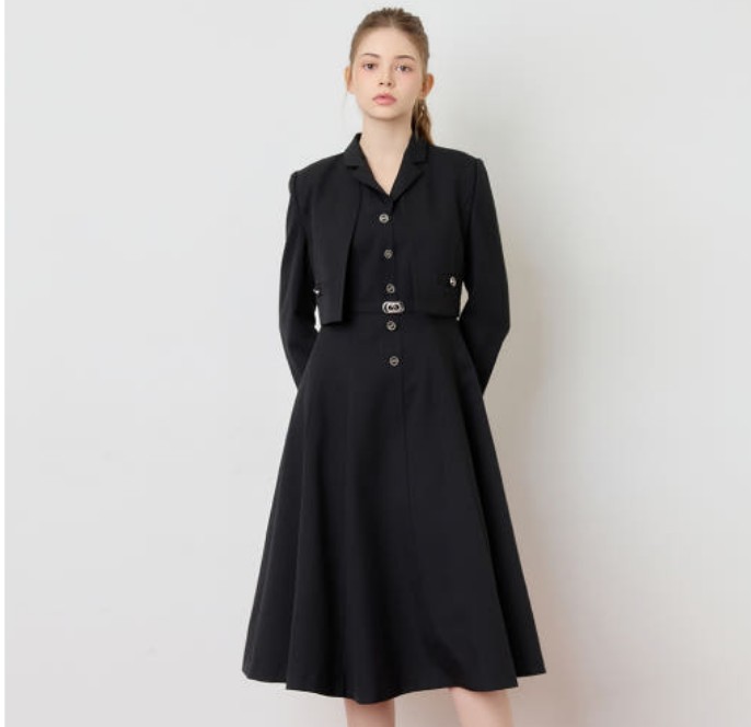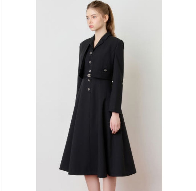 셔츠 원피스와 자켓을 함께 착용한 듯한 디자인이 매력적이며|*|