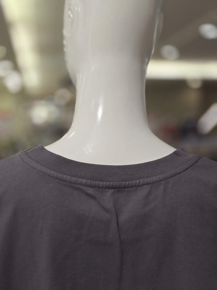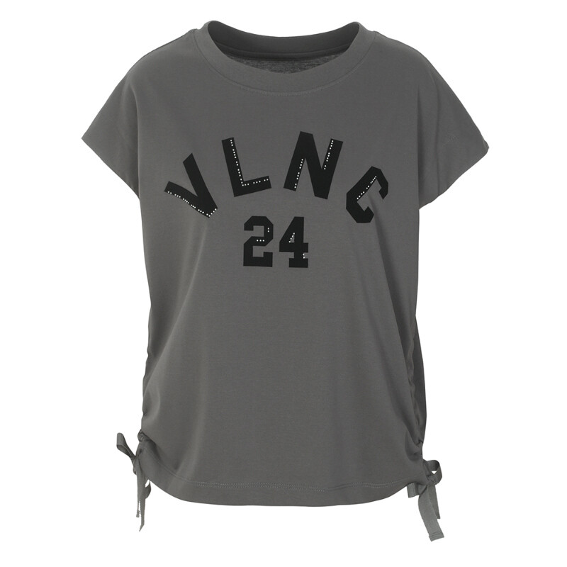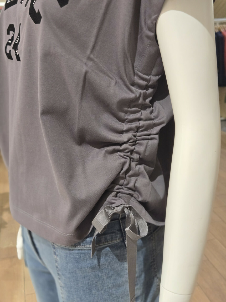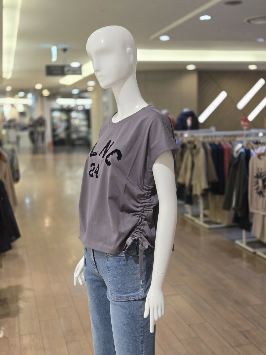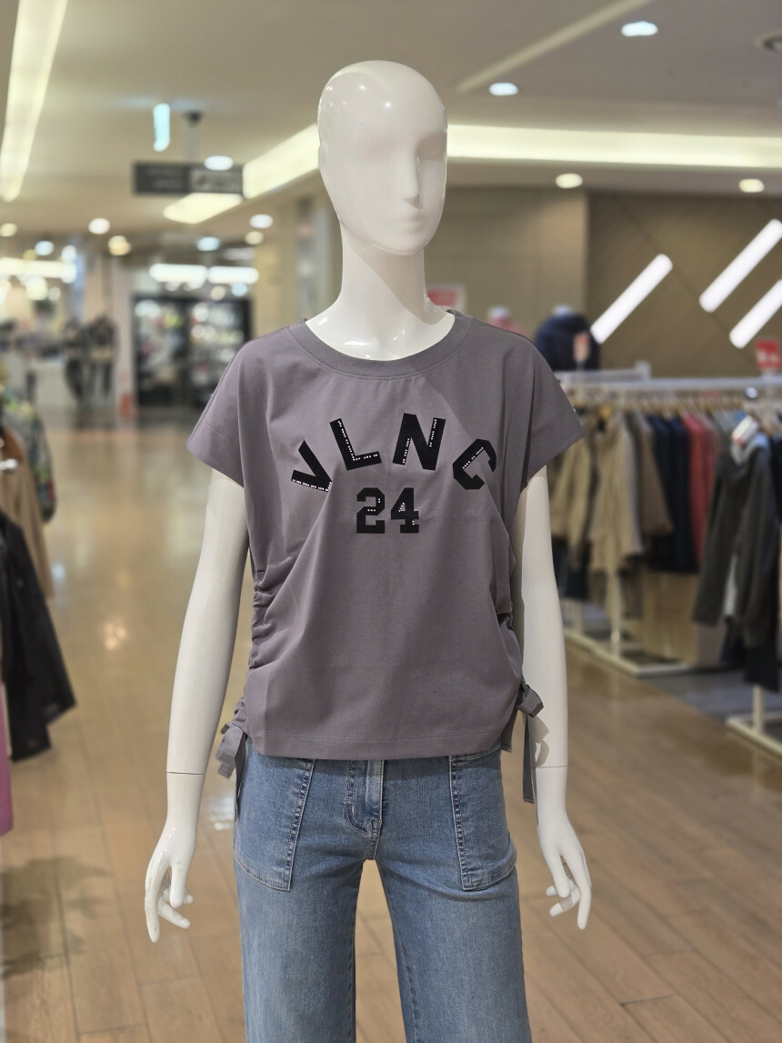 라운드넥에 양사이드 셔링 리본연출되는 앞면 레터링 포인트