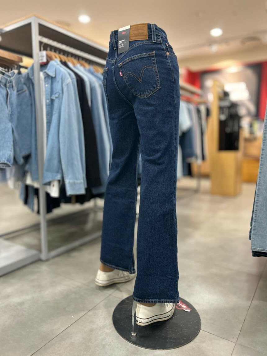 높은 밑위길이에 무릎밑으로 퍼지는 스타일의 여성 부츠컷 청바지로