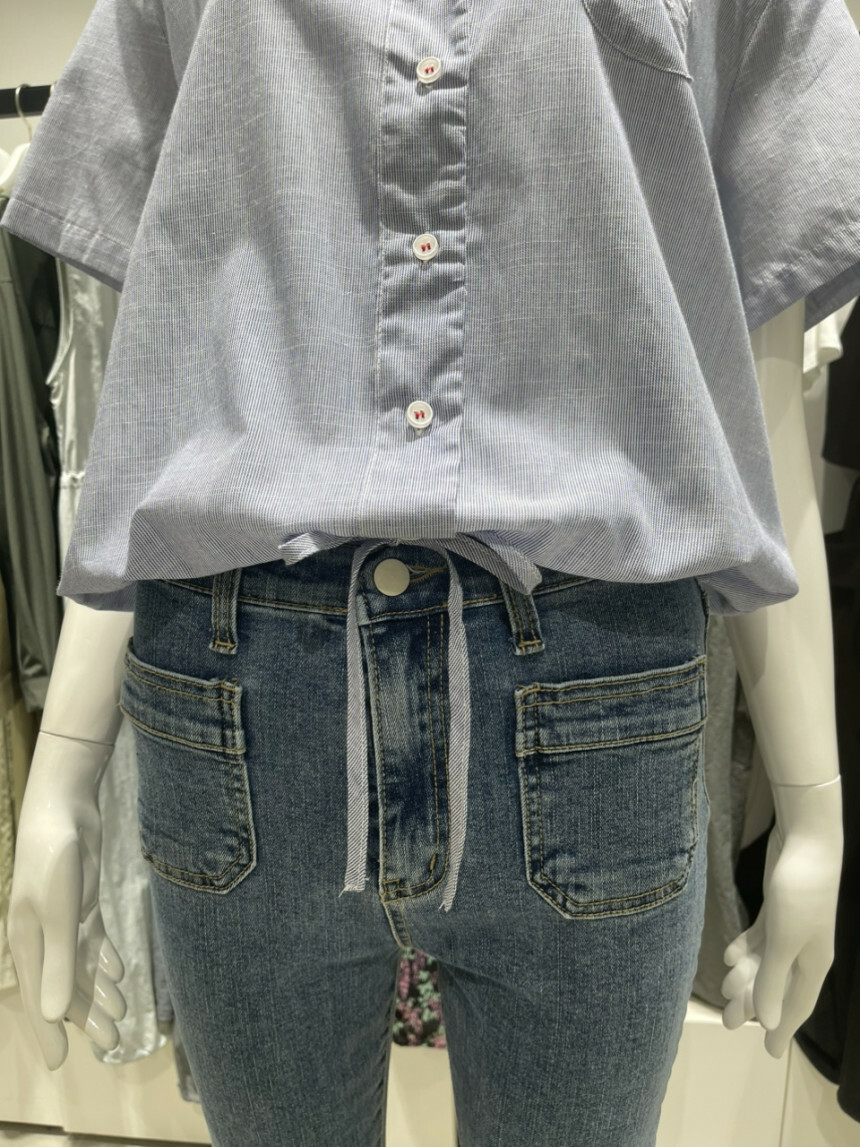 스타일링Tip면100% 소재감포켓이 리본자수 디테일과 하단의 스트링 디자인으로 귀엽고 세련된 느낌이 돋보이는 셔츠넥 블라우스 입니다청바지, 스커트등 다양하게 연출하기 좋은 아이템입니다