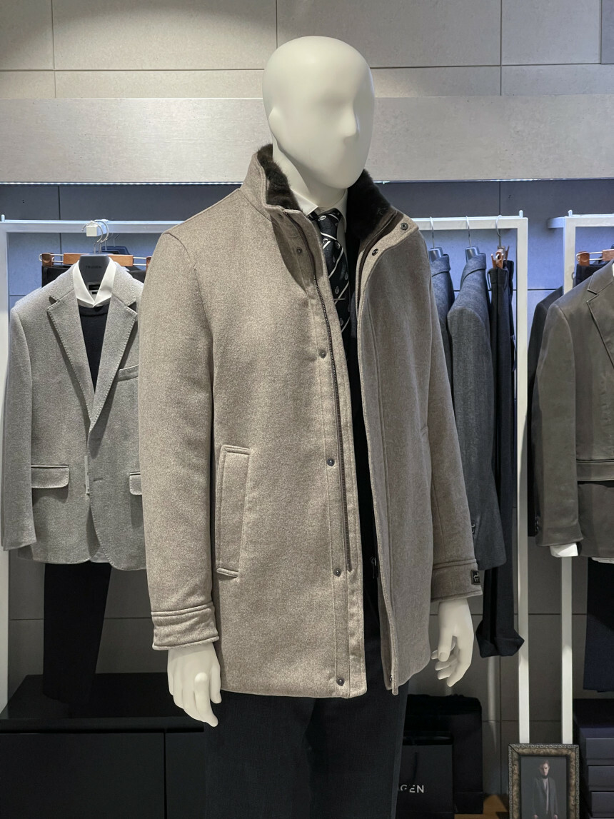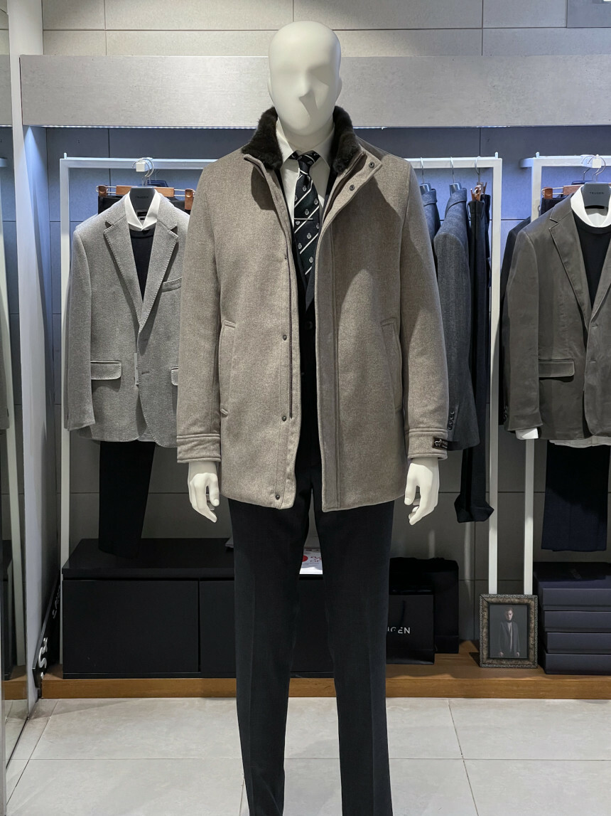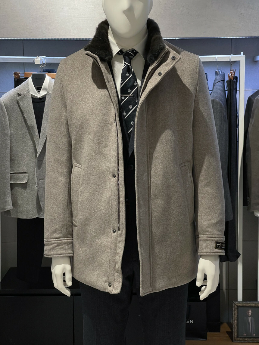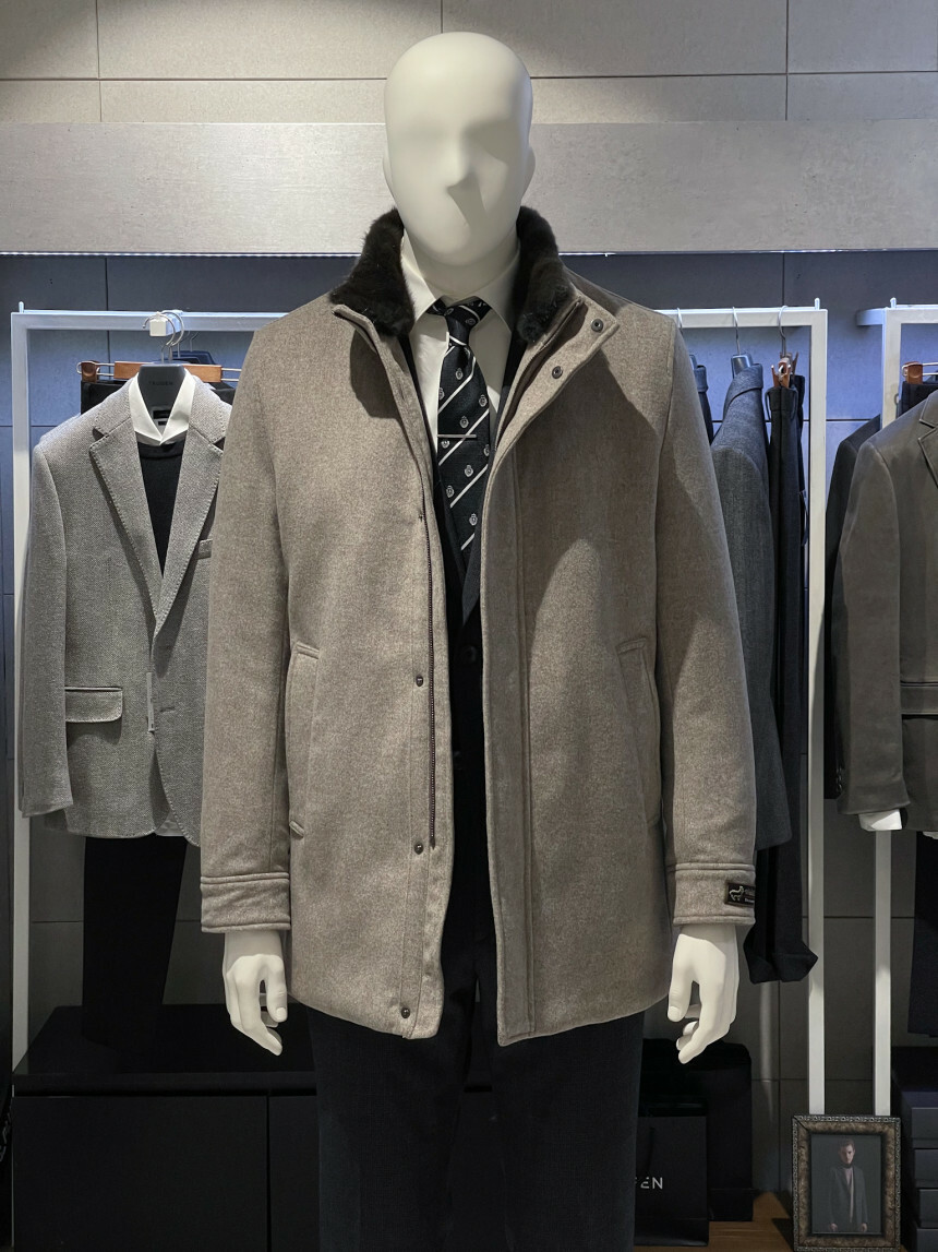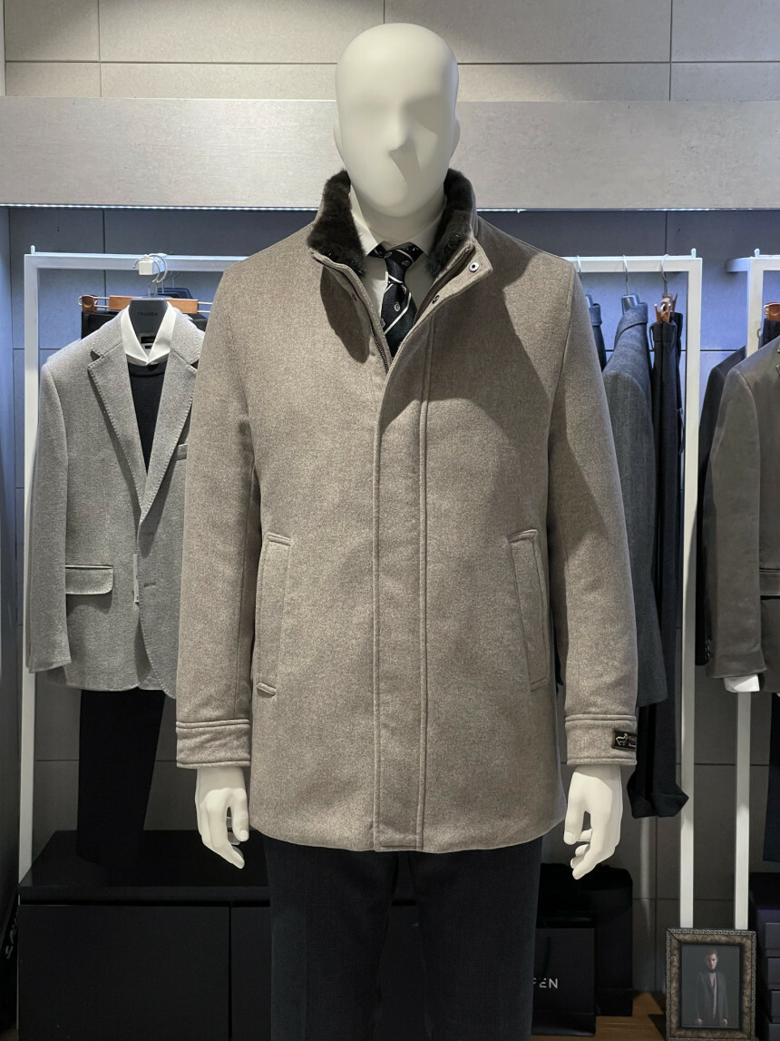 베이지,그레이,브라운 믹스 잔헤링본 소재가 고급스러운 코트입니다
