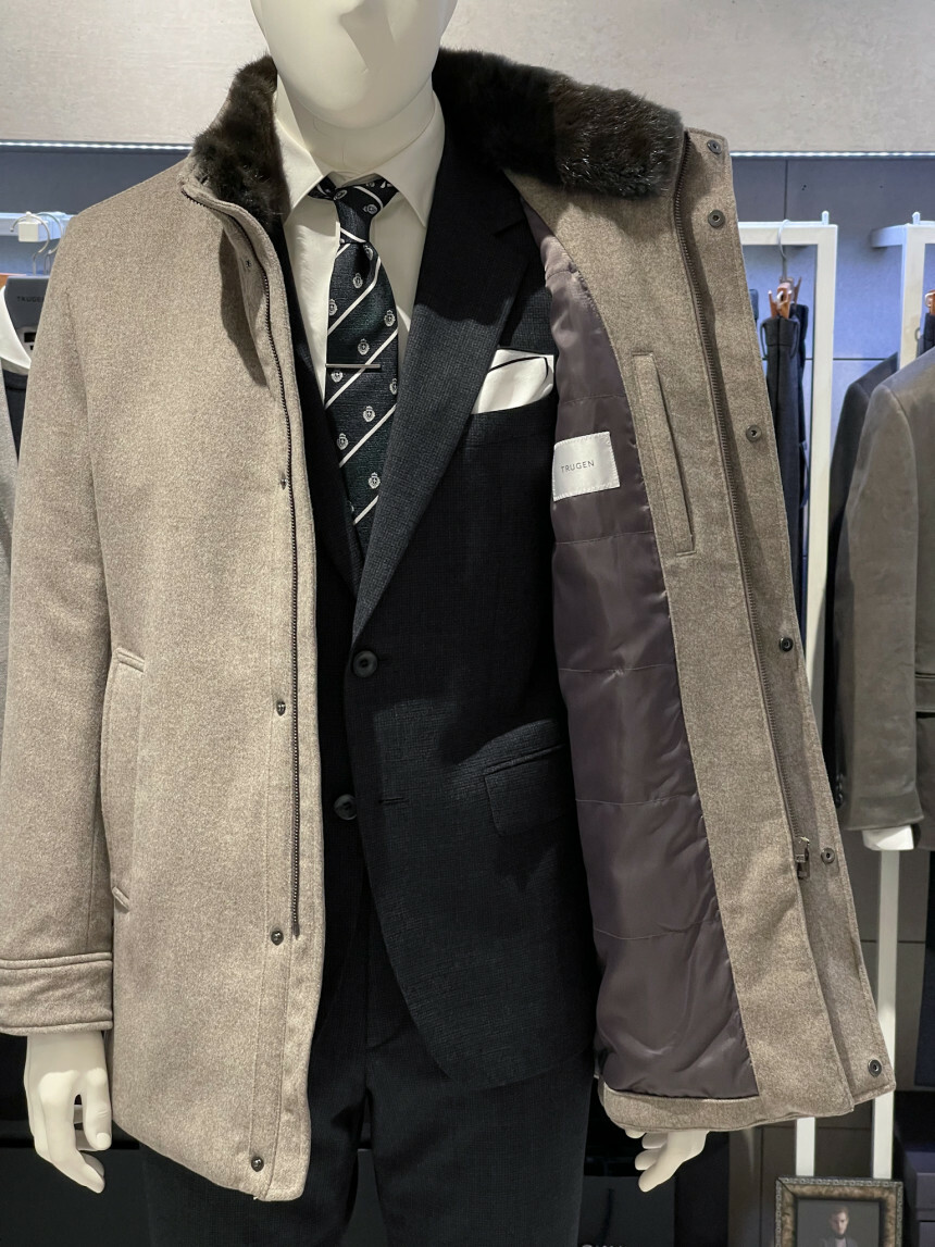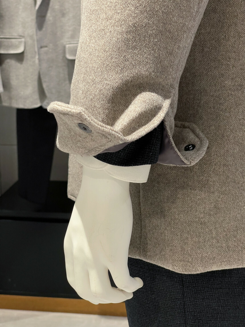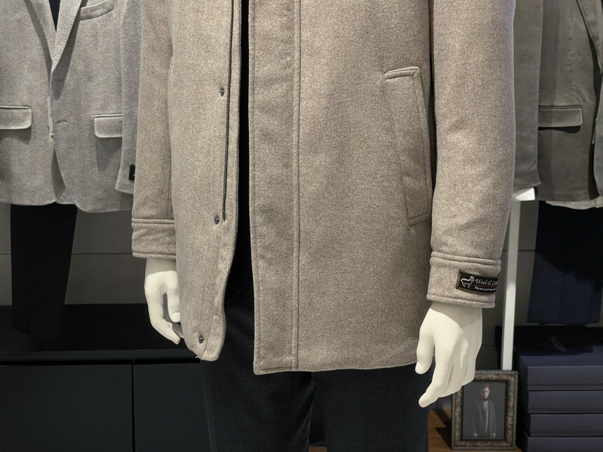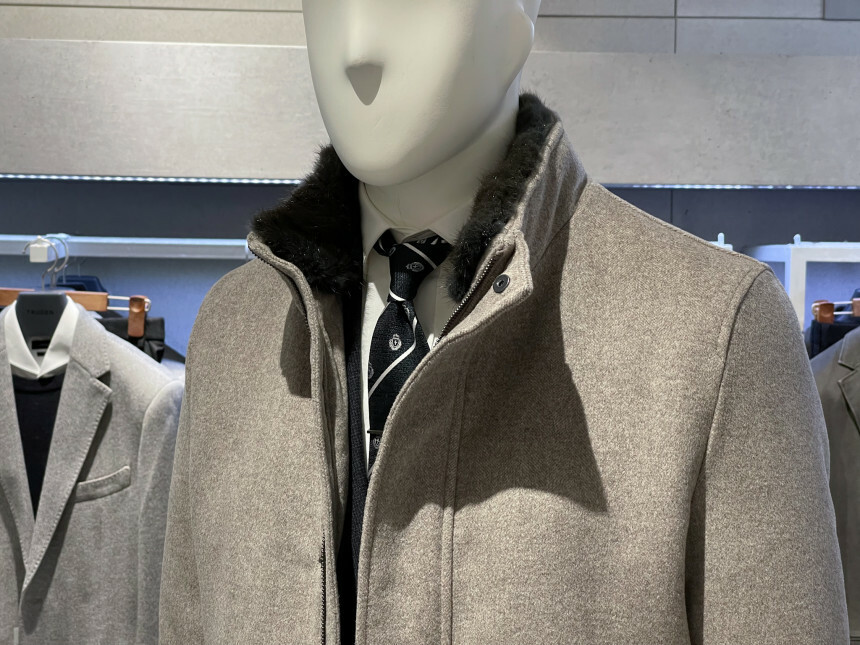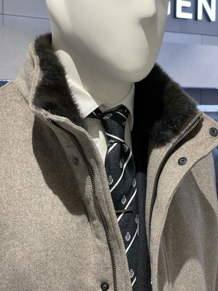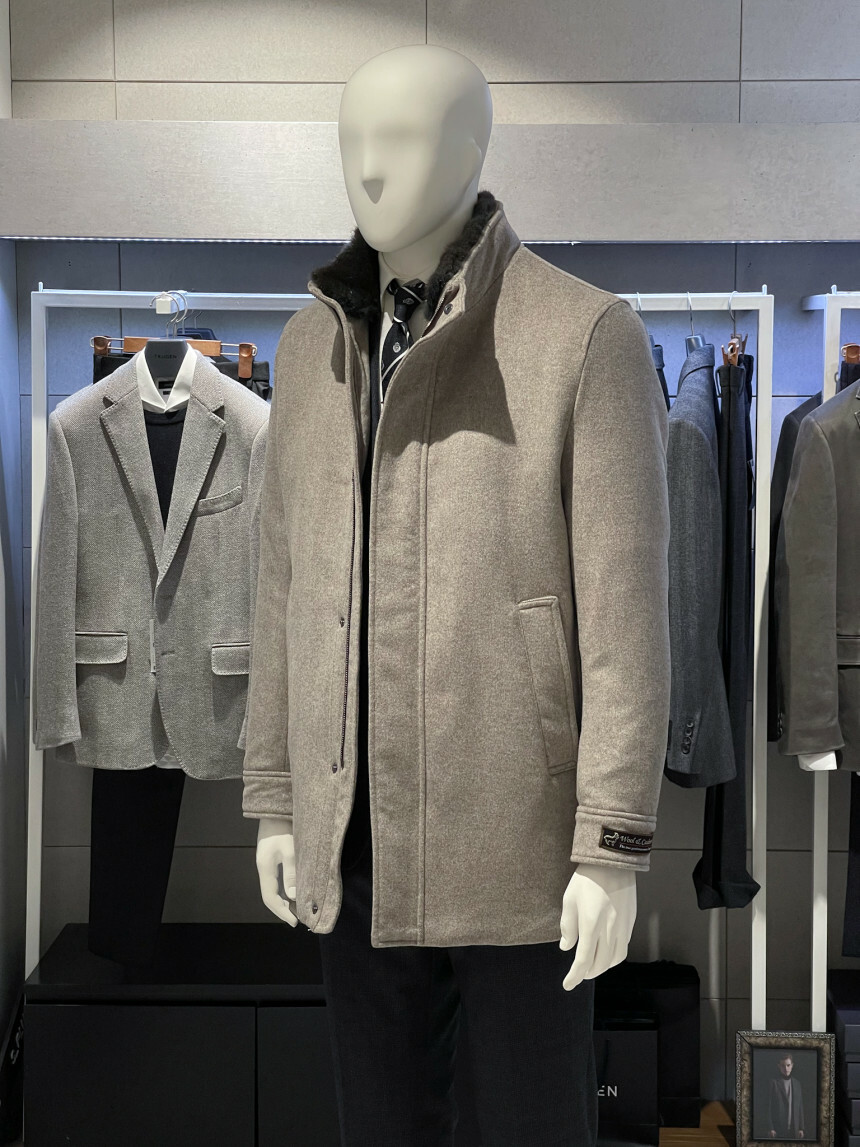 베이지,그레이,브라운 믹스 잔헤링본 소재가 고급스러운 코트입니다