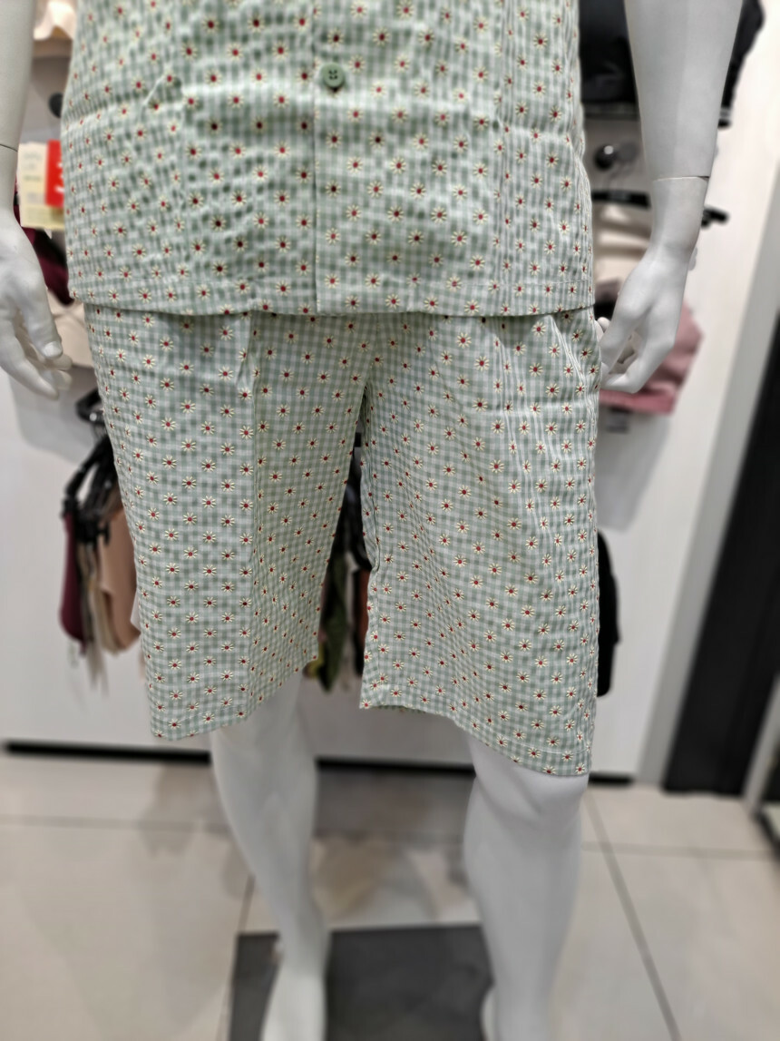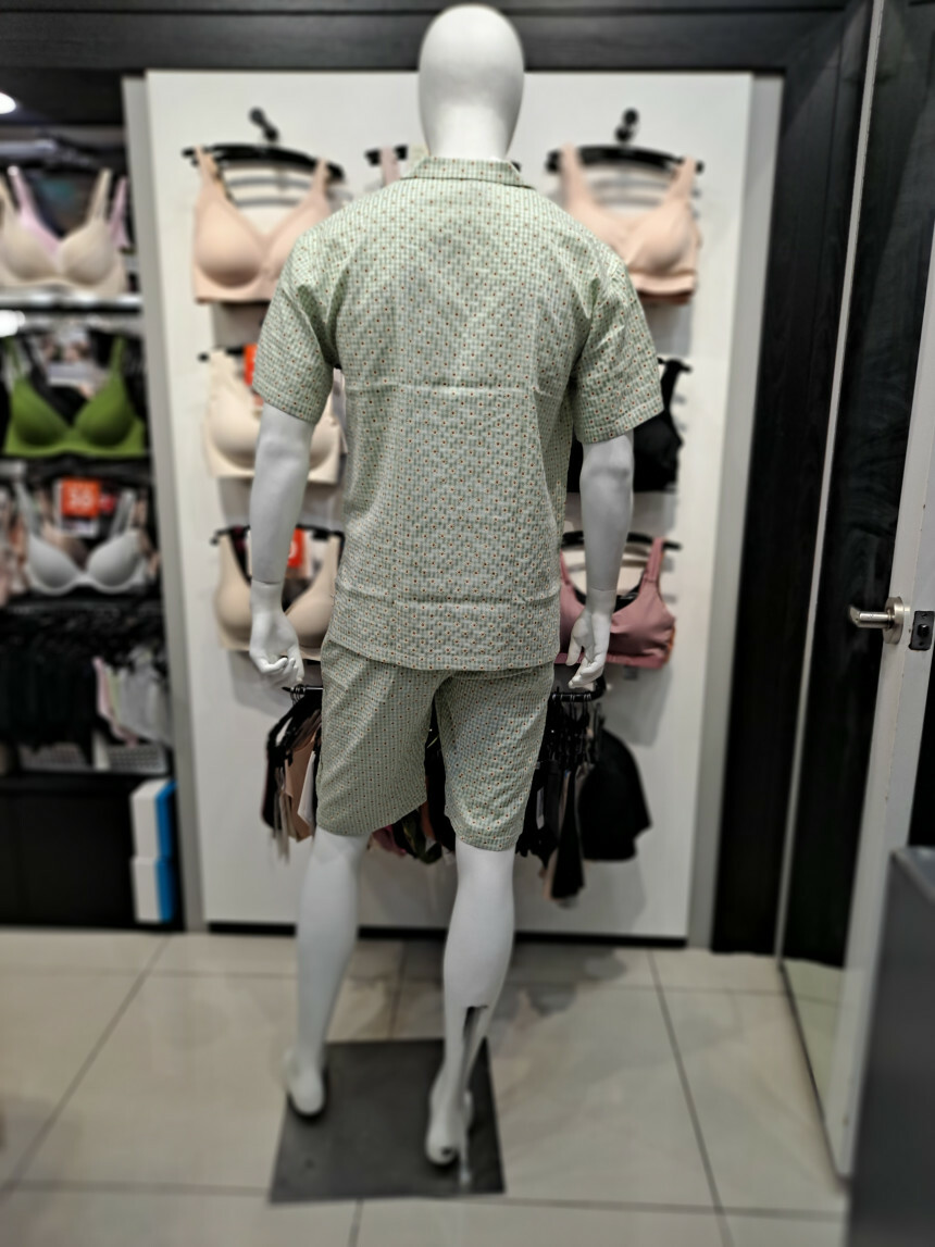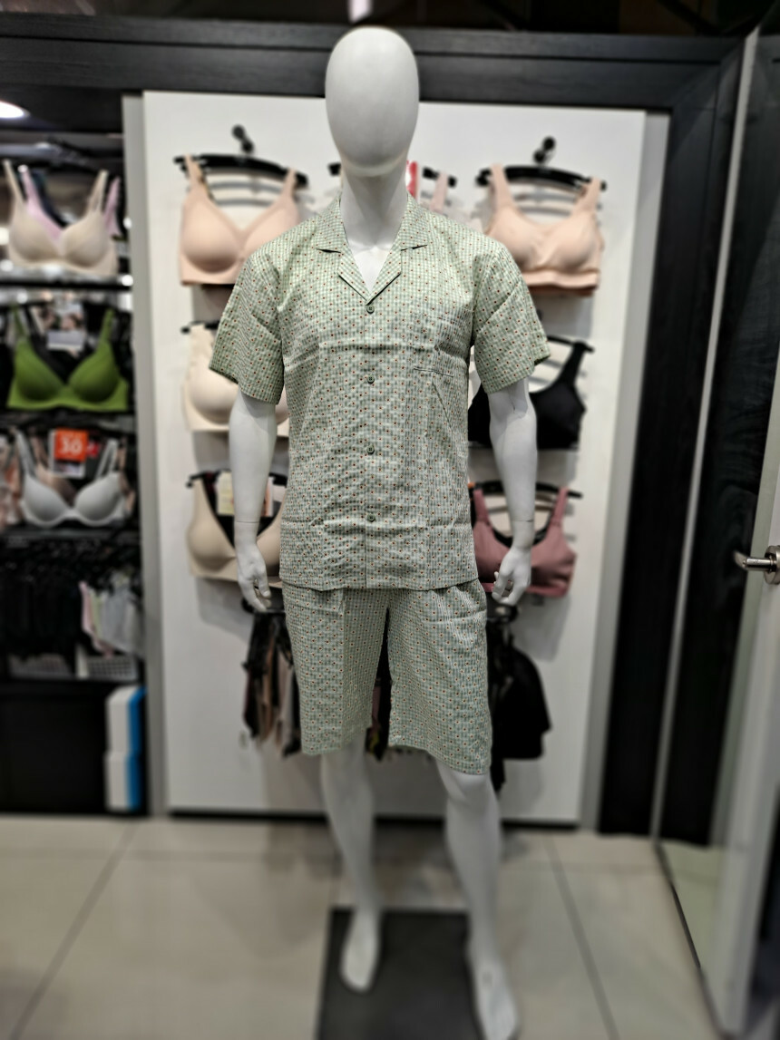 잔잔한 선염체크와 꽃무늬 라바나염이 매치되어 있는 남자 파자마 상하세트.