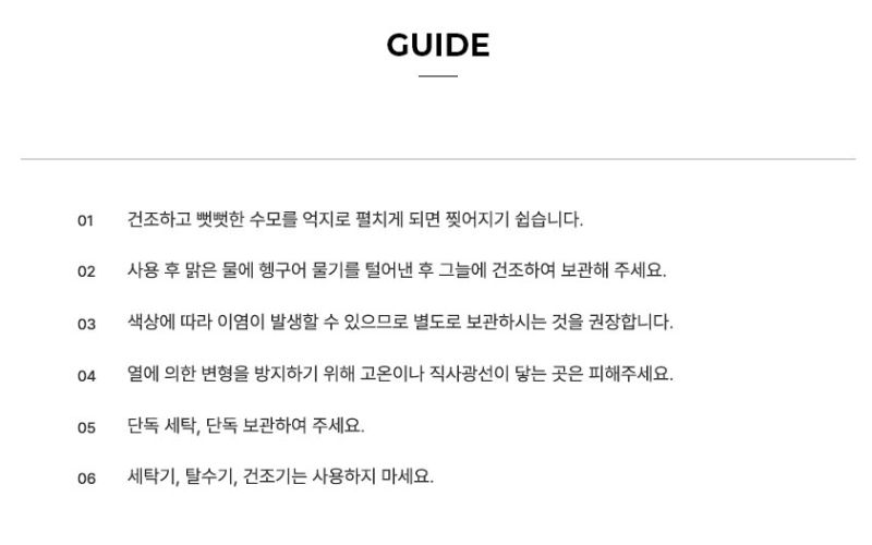 6. 물에 오래 담가두거나 세탁후 그대로 놓아두면 이염될 수 있으니 곧 탈수 건조시켜 주십시오.