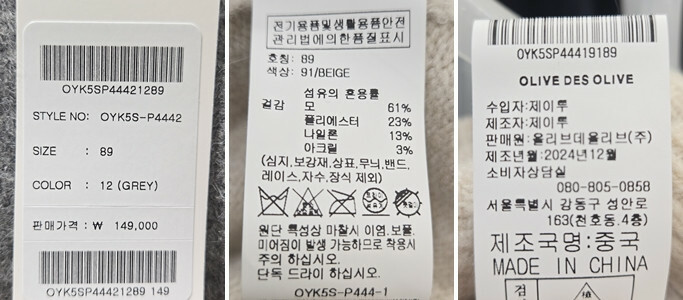 겉감:모61%폴리에스터23%나일론13%아크릴3%