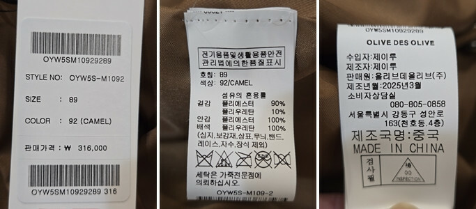 · 안감 : ■ 전체 □ 부분 □ 없음