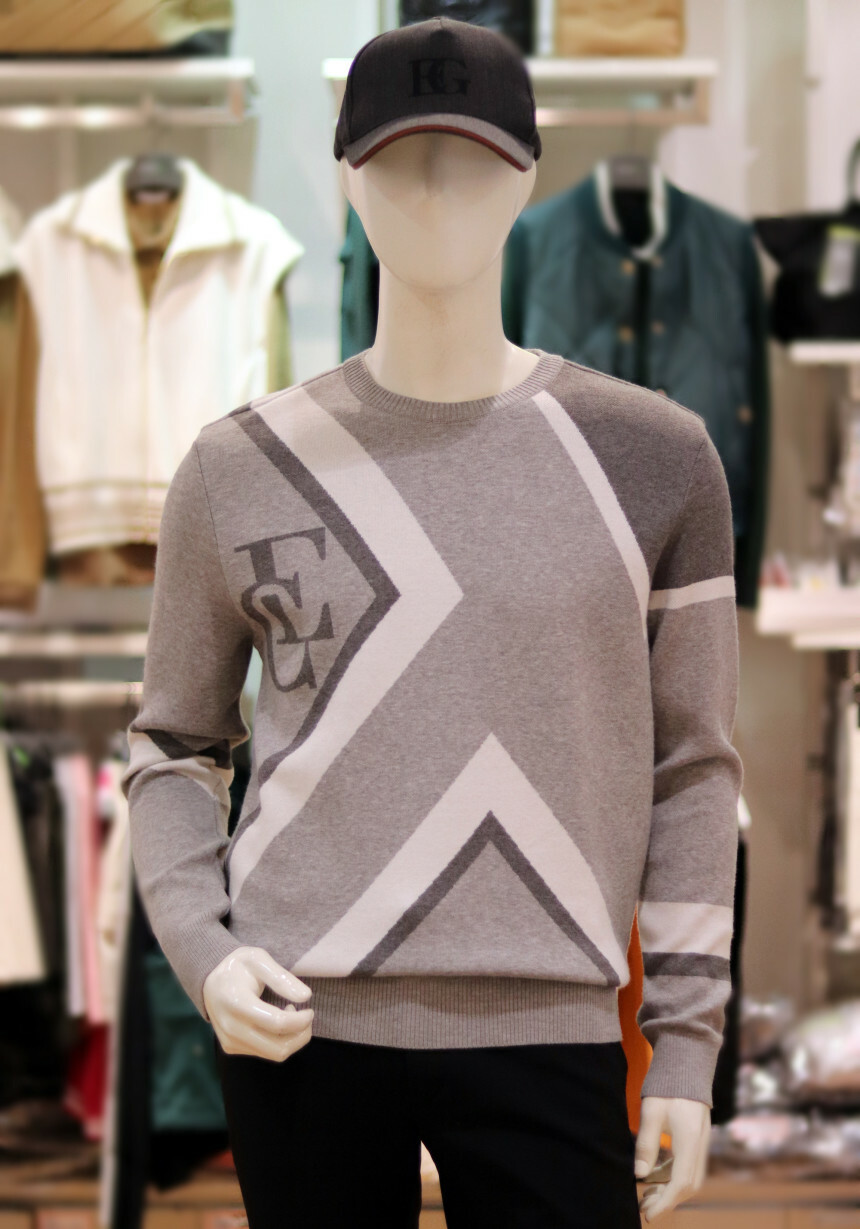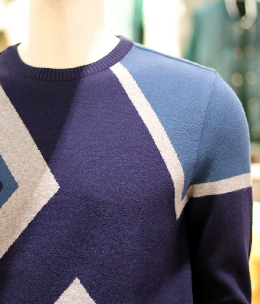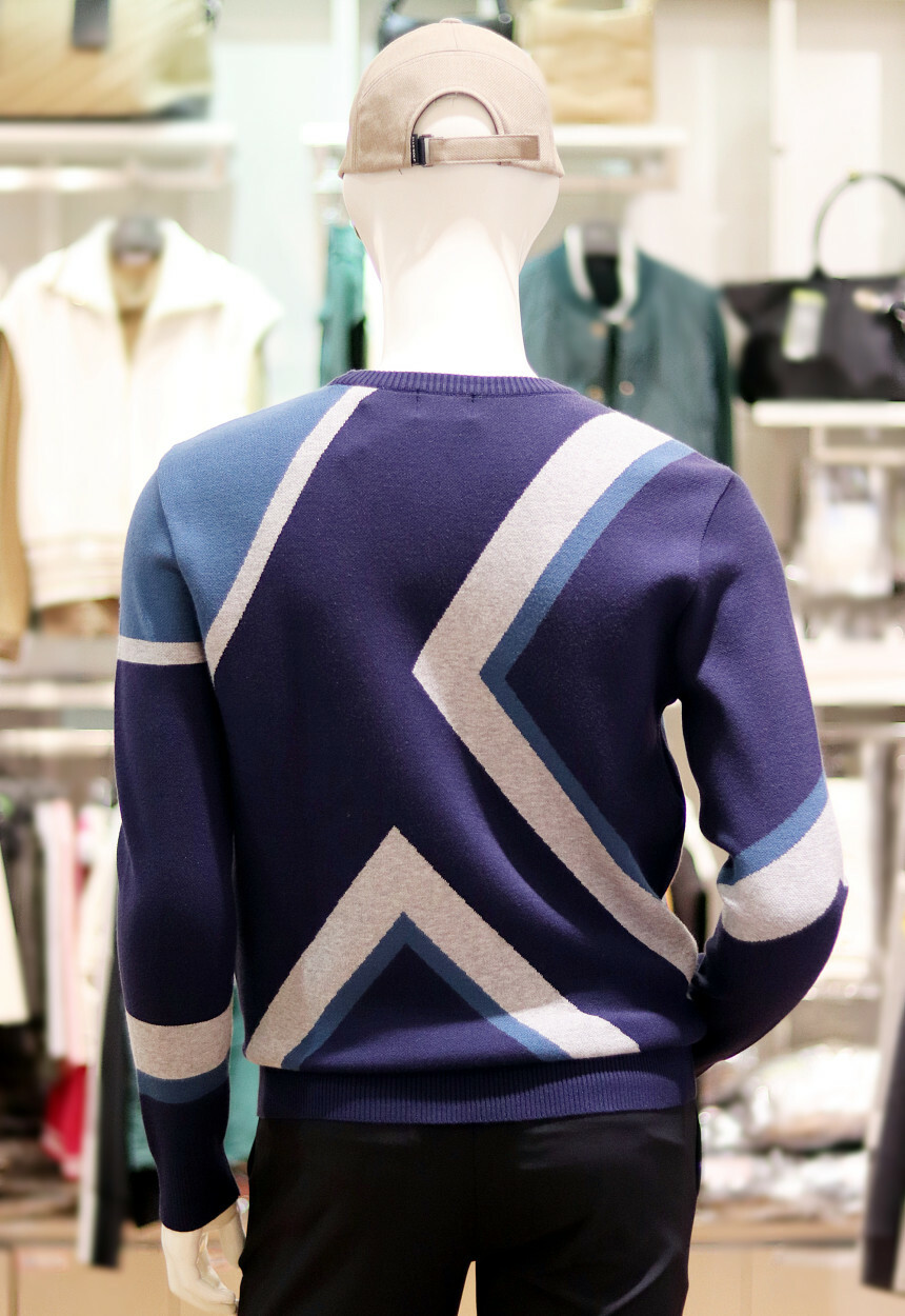 활용하시기 좋은 빅패턴의 풀오버 자가드 라운드 스웨터입니다