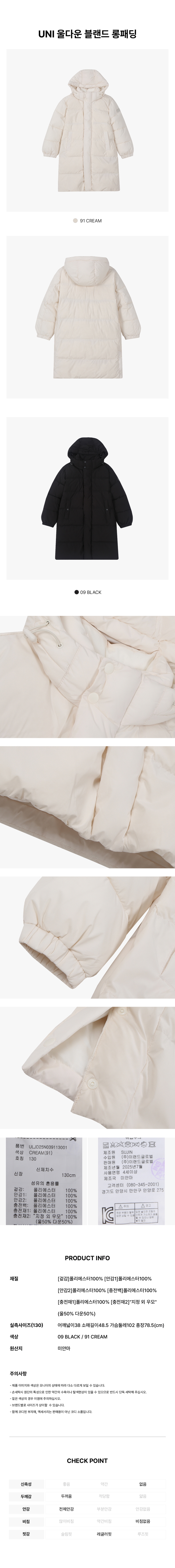 제품소재 : [겉감]폴리에스터100% [안감1]폴리에스터100% [안감2]폴리에스터100% [충전백]폴리에스터100% [충전재1]폴리에스터100% [충전재2]"지정 외 우모" (울50% 다운50%)