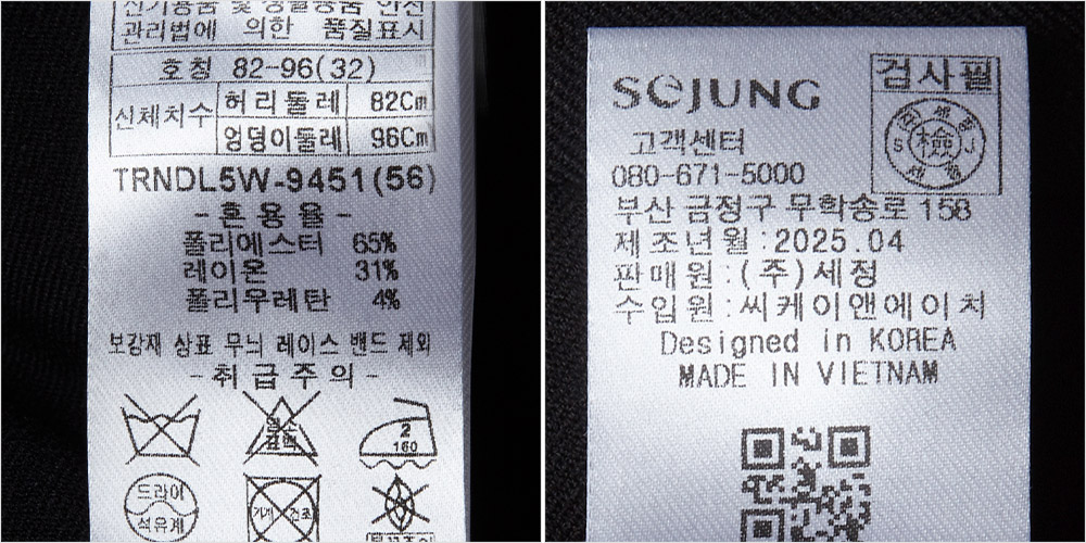 제품소재 : 폴리에스터65%, 레이온31%, 폴리우레탄4%