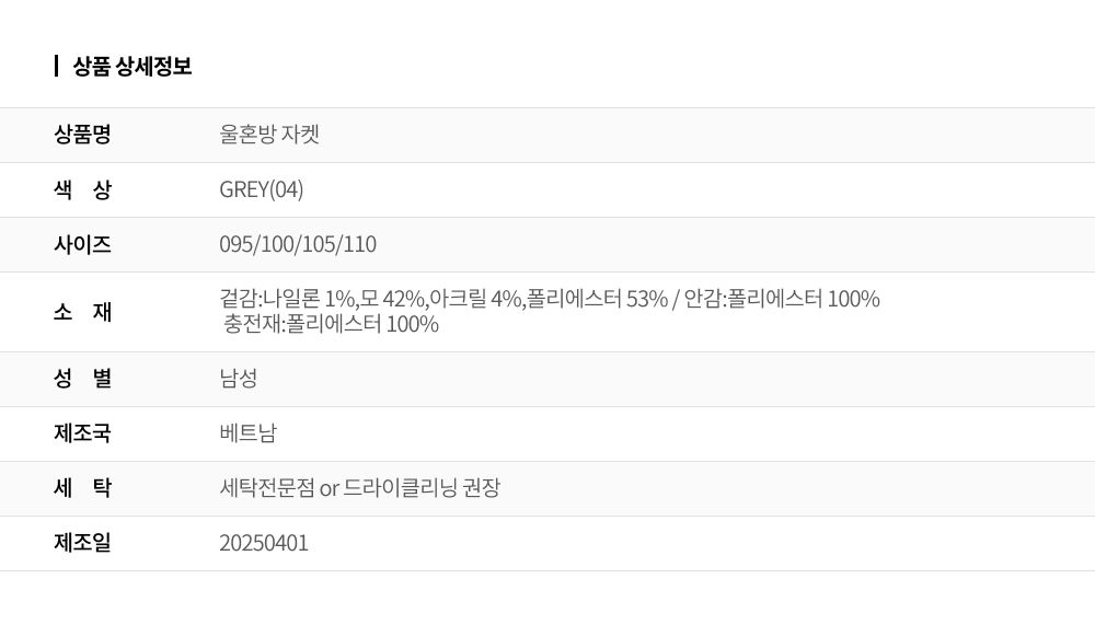 제품소재 : 겉감 폴리에스터53%, 모42%, 아크릴4%, 나일론1%