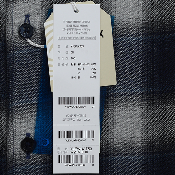 제품소재 : (겉감 폴리에스터63%/레이온30%/모7%) (배색 면100%)