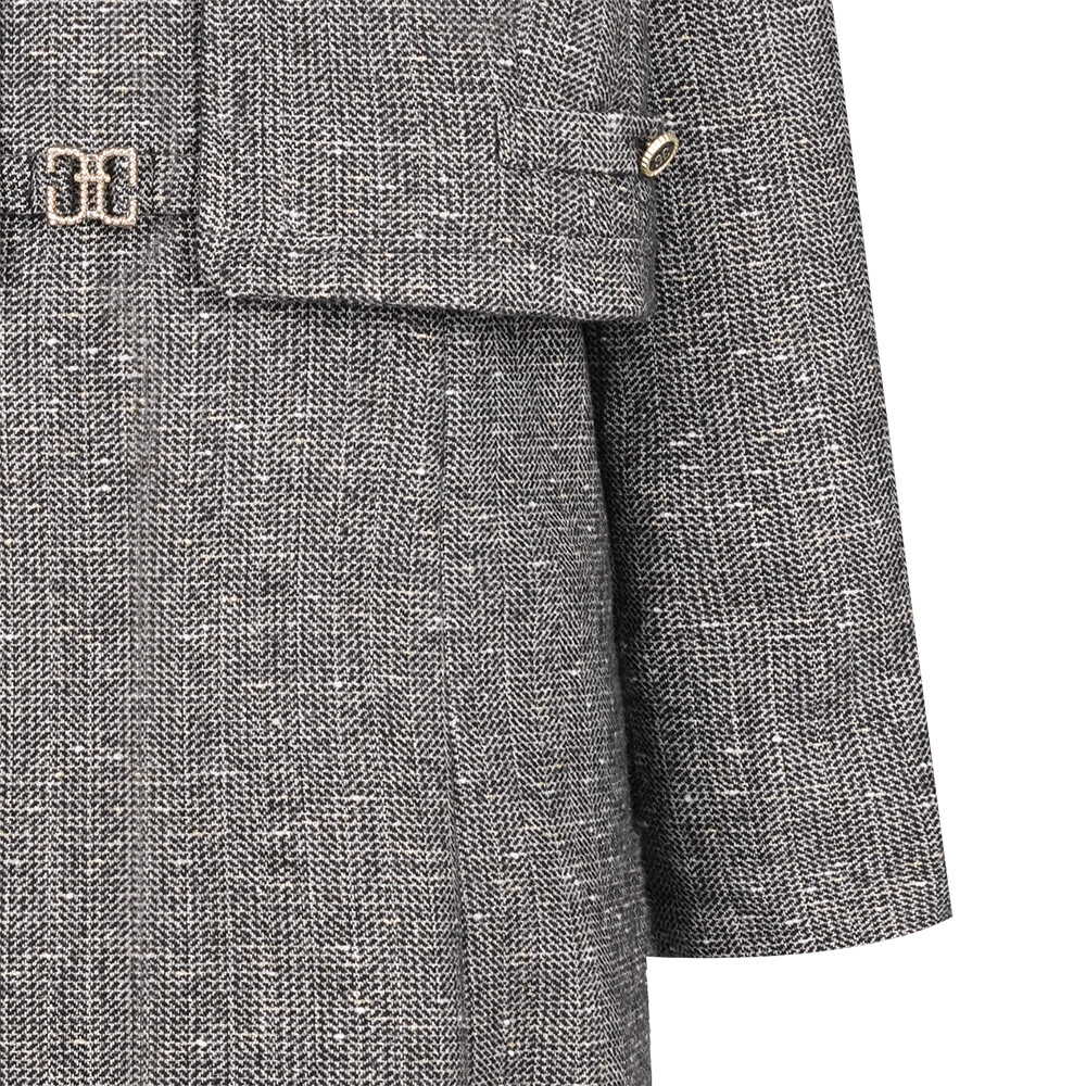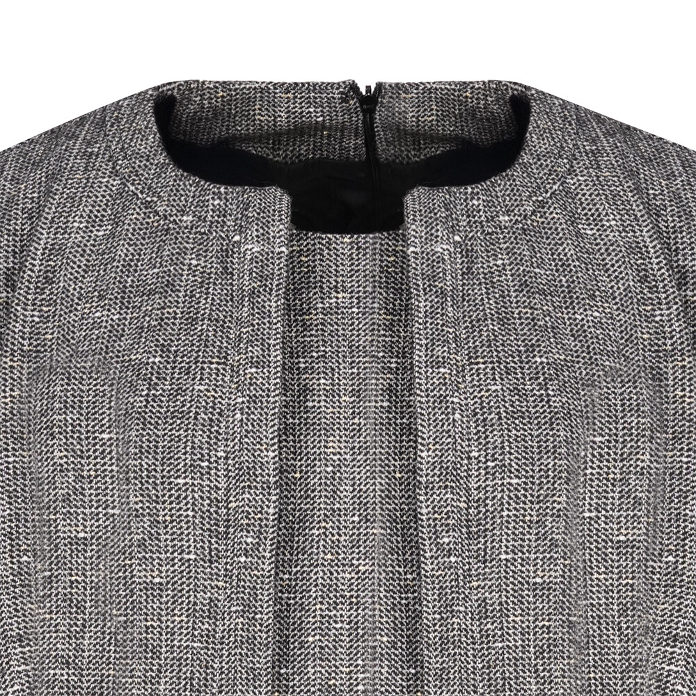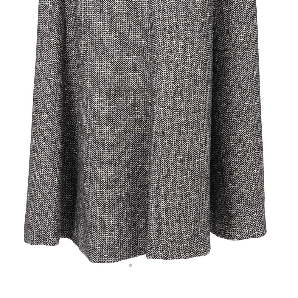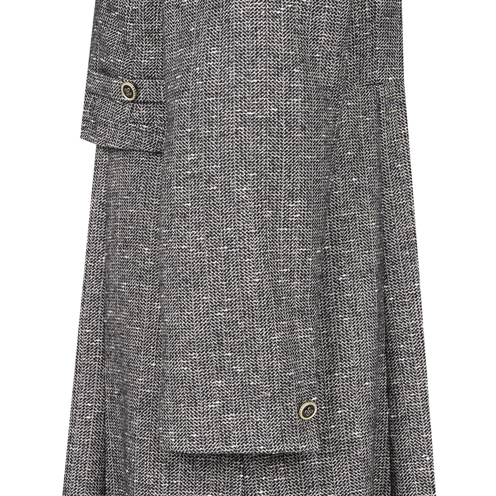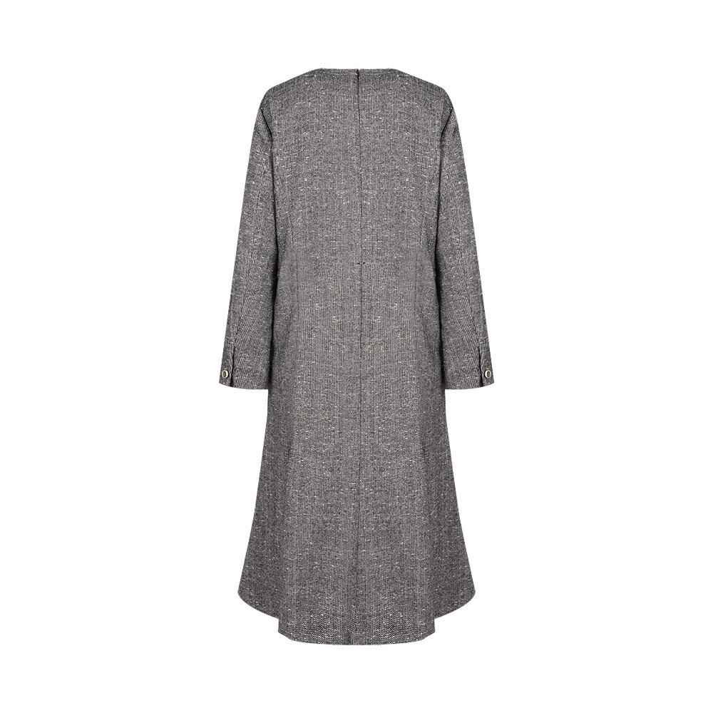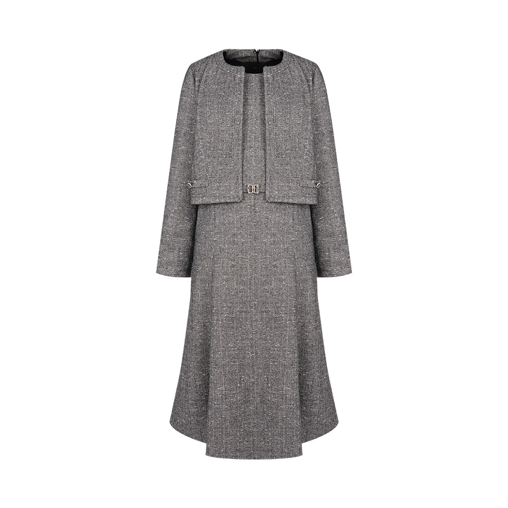 페미닌한 무드가 느껴지는 미디 기장의 원피스입니다. 자켓을 레이어드한 듯한 디자인이 포인트인 아이템입니다. 울 혼방의 메탈릭사가 섞인 소재로 고급스럽고 격식 있는 자리에 추천드리는 아이템입니다.