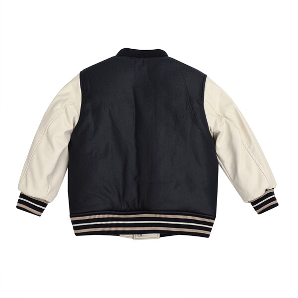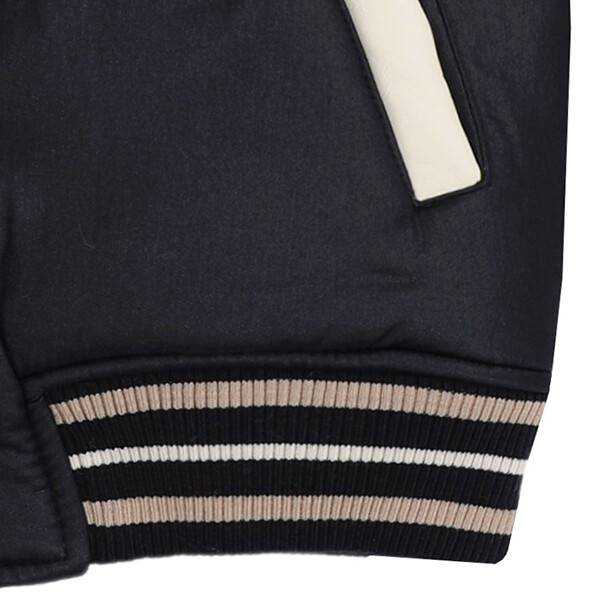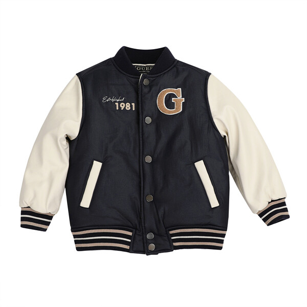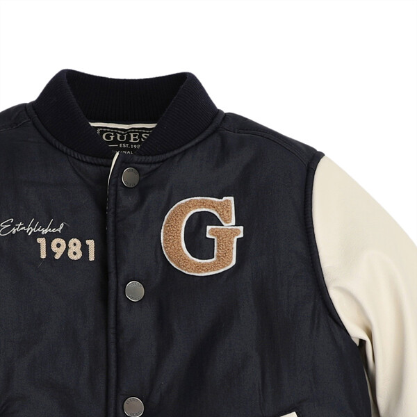 - 광택감있는 화섬소재와 레쟈를 믹스한 게스 배색 야구 점퍼
