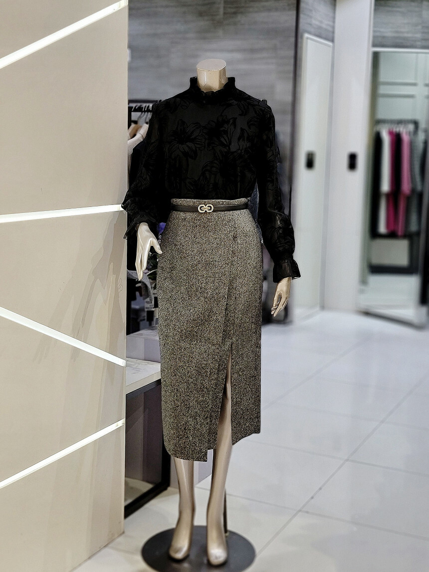프릴 넥 라인으로 우아한 무드를 더하며