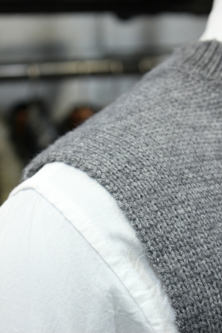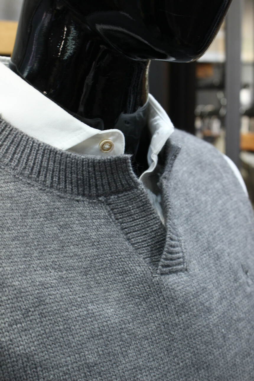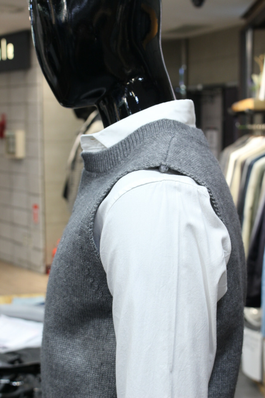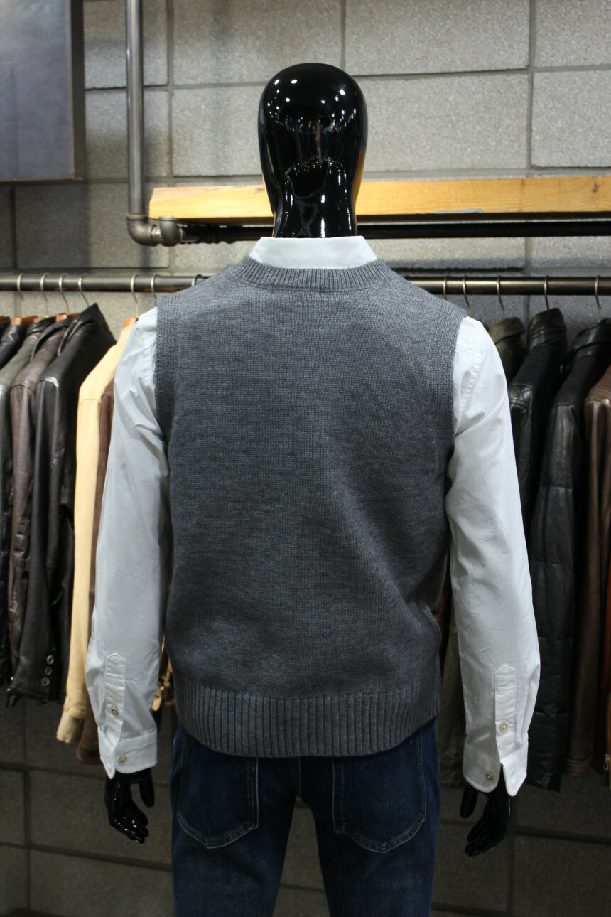 오픈슬릿넥으로 셔츠,남방과의 코디가 좋으며 라운드넥티나 얇은니트와 레이어링할수도 있습니다